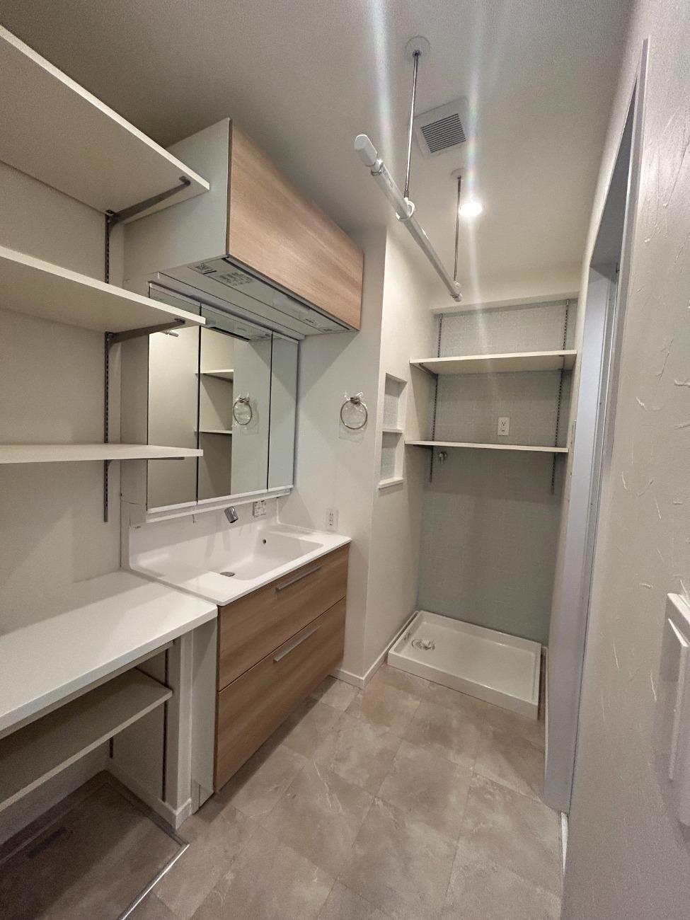 化粧台間口をコンパクトにして、脇に作業できるスペースを確保しました。固定のカウンターと好きな高さにいつでも移動できる可動棚を設け、洗濯物を置いたり、アイロンがけをしたり、入浴の際には着替え置き場にもなる便利なスペースができました。