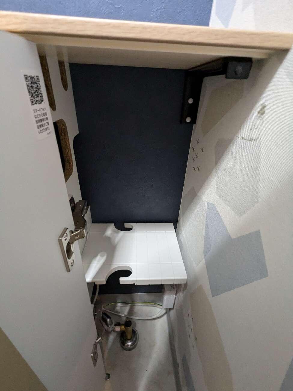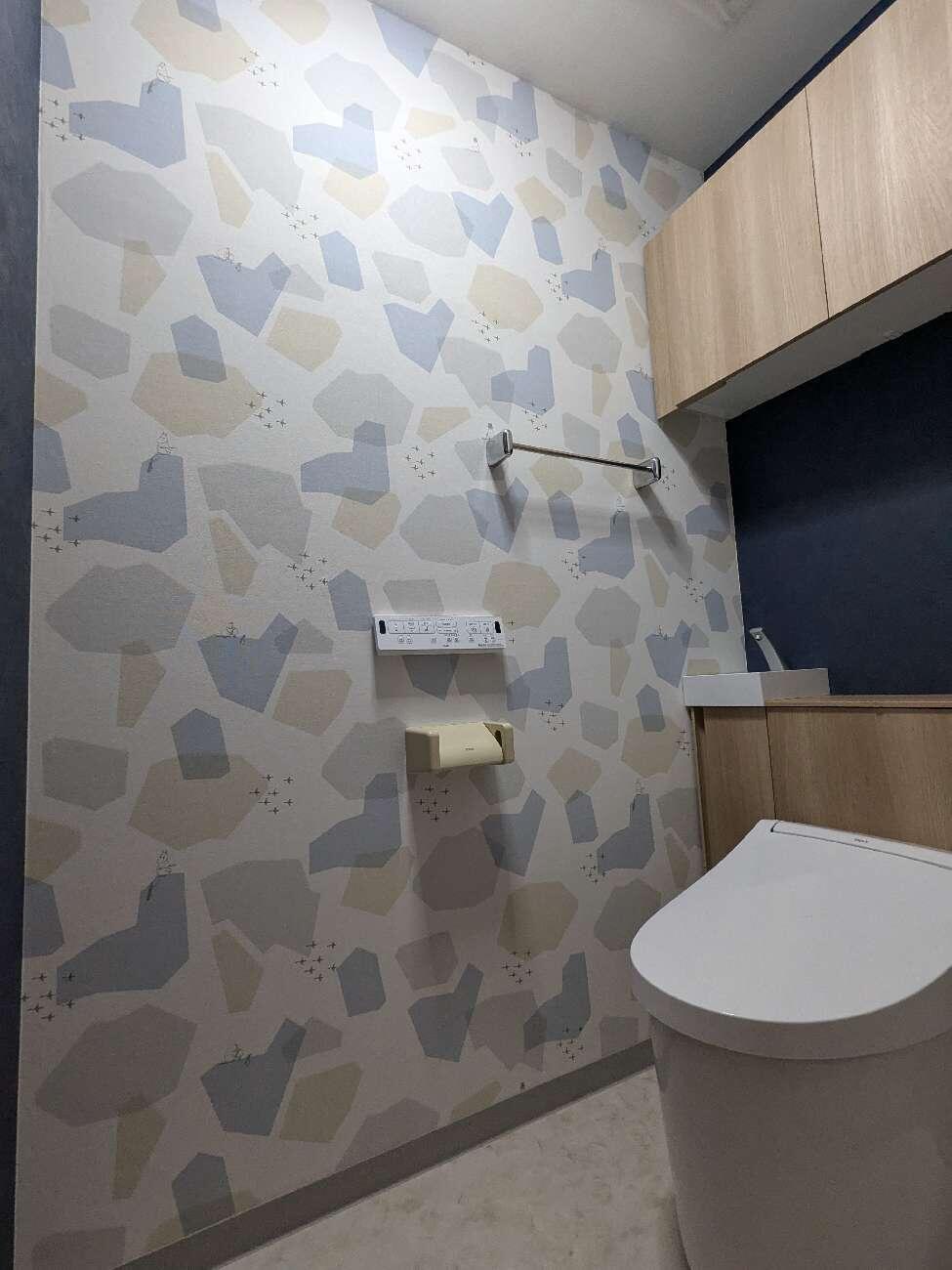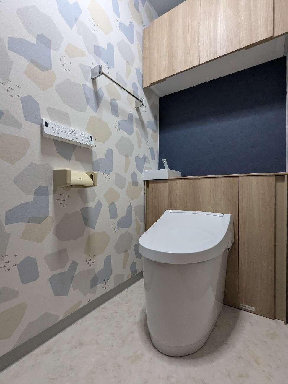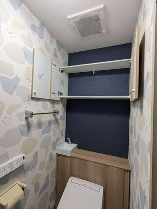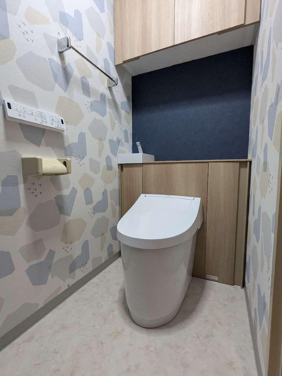 便器後ろの両サイドに収納空間があり+アッパーキャビネットも取り付けたことで十分な収納を確保できました。折角の機会なので内装にもこだわっていただけるよう種類の多いカタログをお渡ししてご検討いただきました。じっくりご検討いただきご納得いただける改装になり私共もとても嬉しいです。
