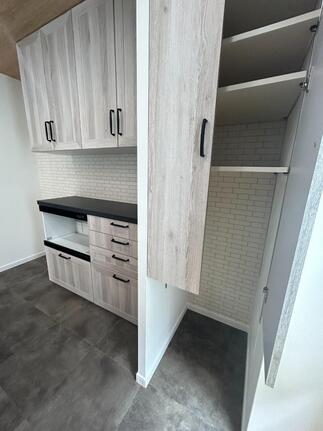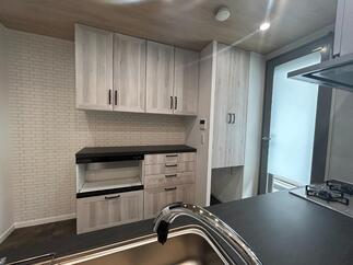 キッチン背面の収納と造作収納はデザイナーと綿密に打ち合わせをして設計させて頂きました ゴミ箱収納やストック収納など主婦ならではのお悩みなども私達女性スタッフにてご対応させて頂きました 快適にお使い頂けていることと存じます 定期的にご連絡させて頂いているので、使い勝手などのその後の感想を聞いてみたいと思います