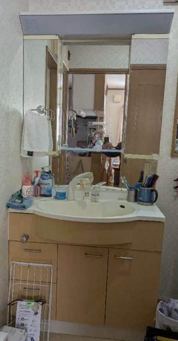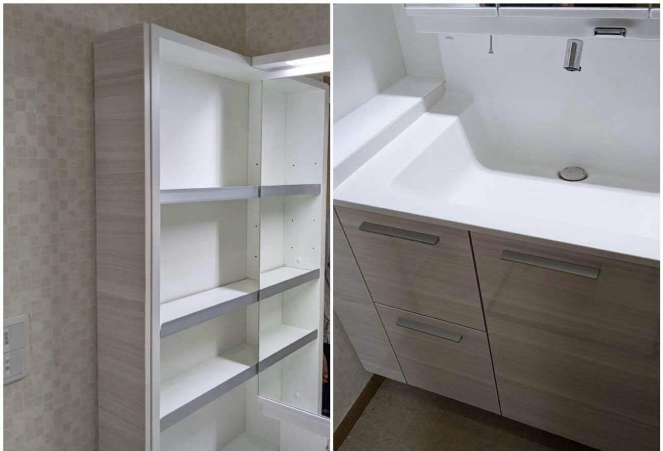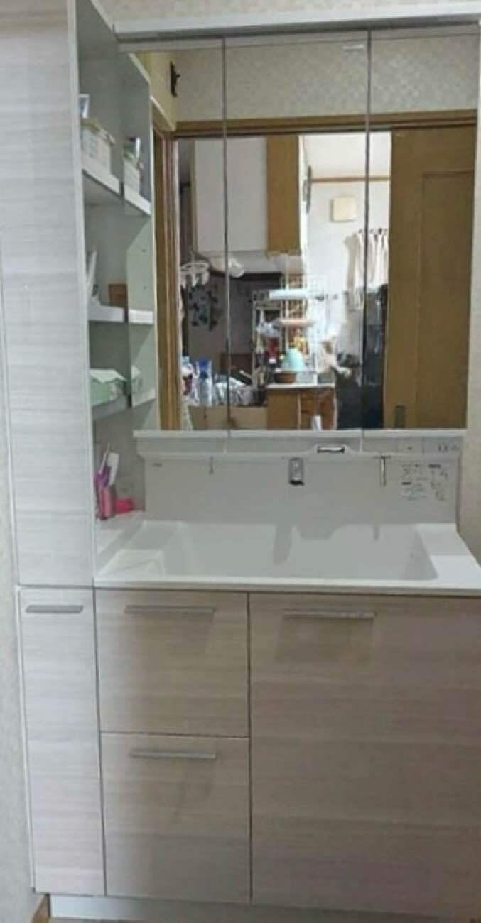 今までの洗面化粧台の収納が少なくて細々した物の収納に困っているとのご相談でしたので LIXILのクレヴィをご提案させていただきました。 左側のオープンの棚も物の出し入れもしやすくなっています。 もちろん、ミラーキャビネットにもたっぷりと収納できます。 清掃性も優れていて吐水口の位置が上にあるので気になっていた蛇口付近のお掃除も楽になりますね。 洗面室が明るい雰囲気になりました。
