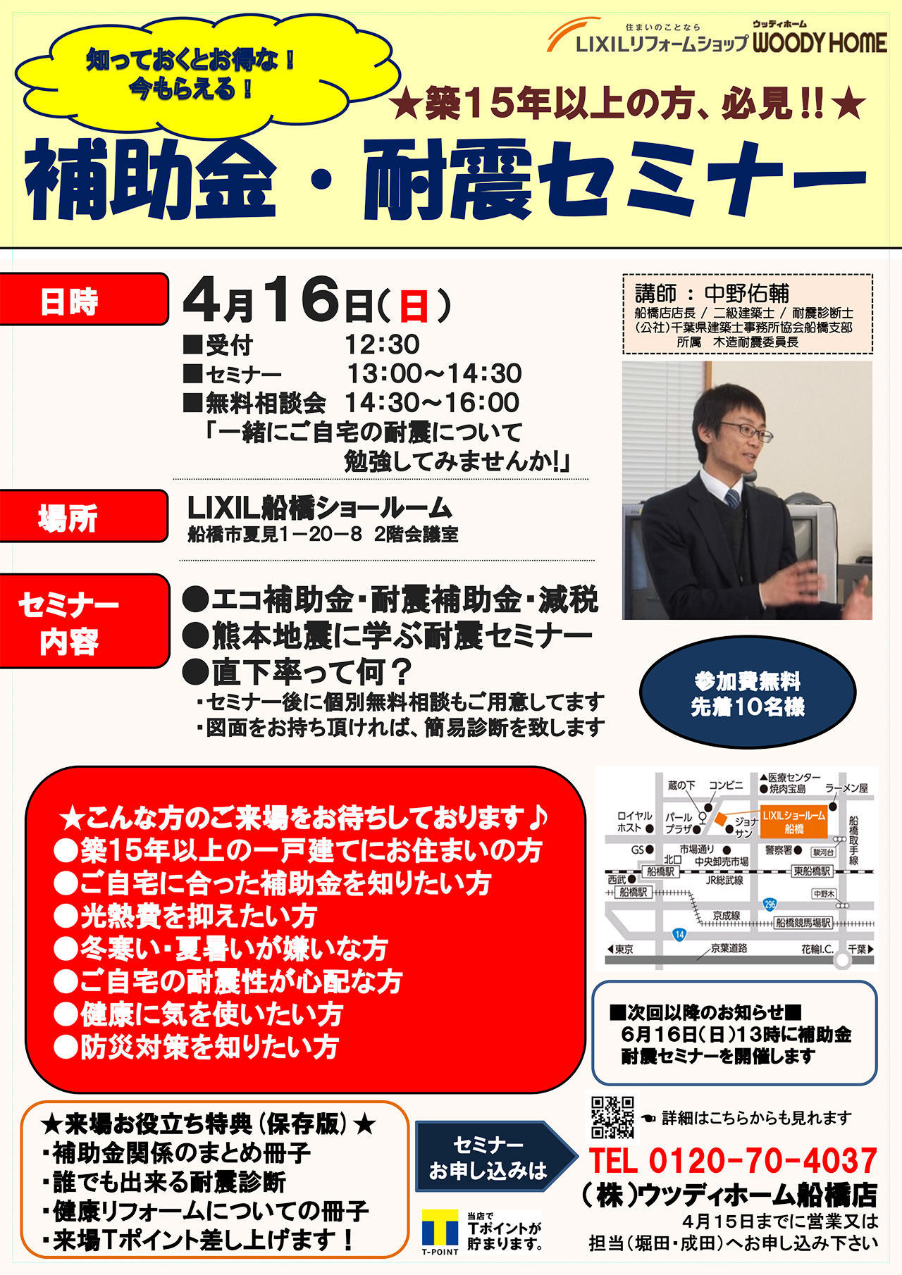 当日は、ウッディホーム船橋店主催の補助金と耐震の勉強会を実施いたします。
