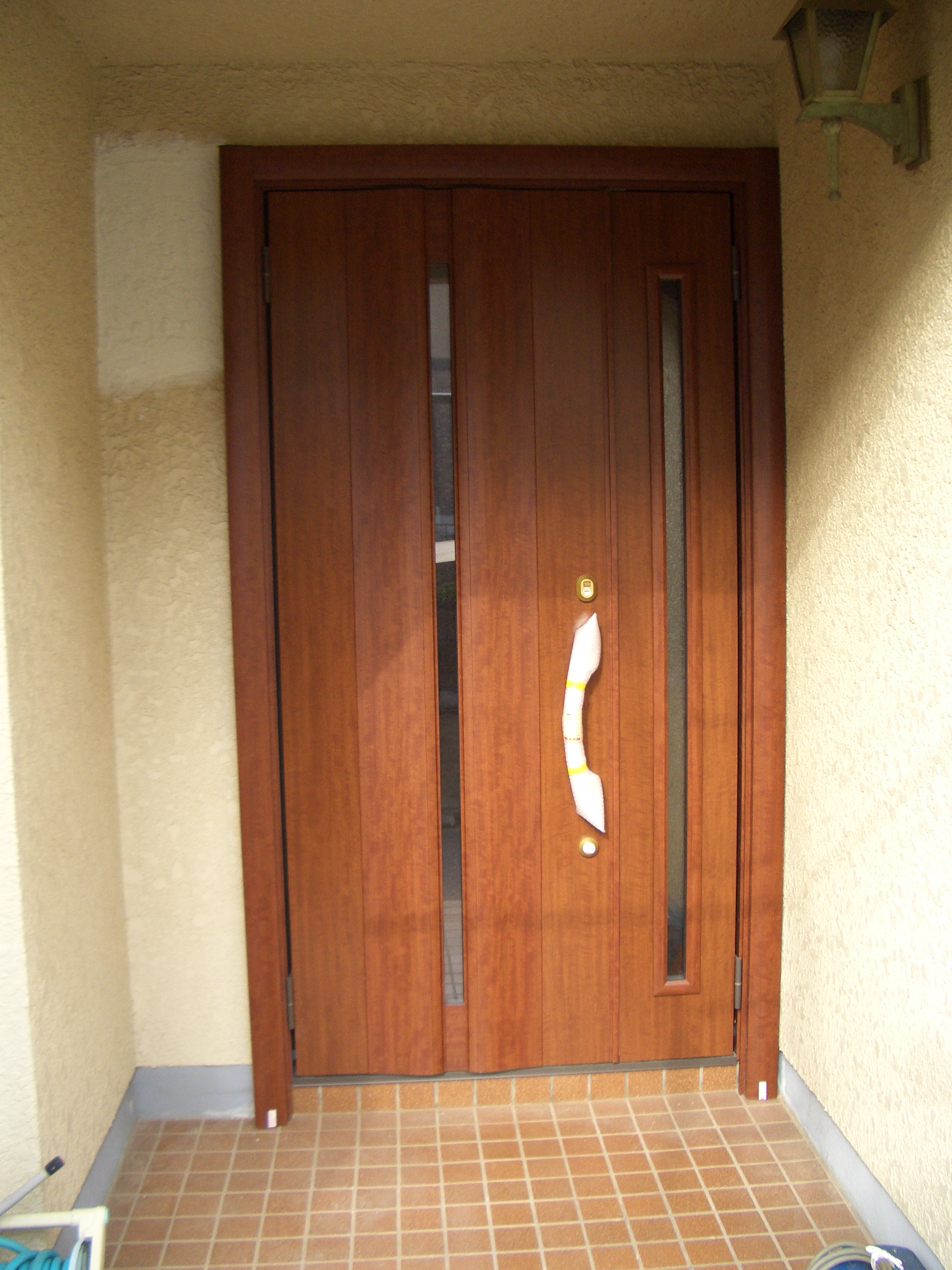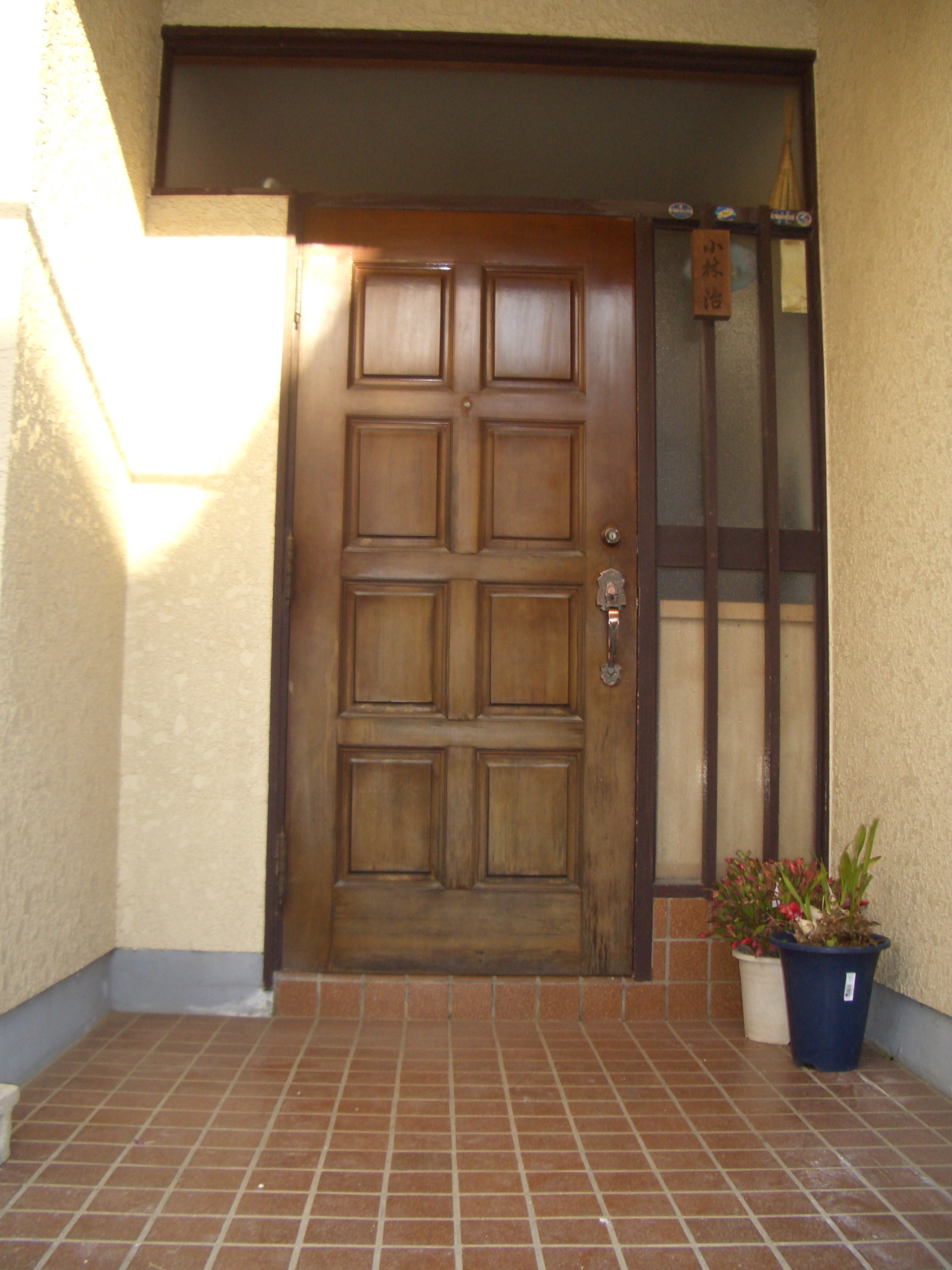 外壁塗替え工事を機会に、木製ドアからアルミドアに入れ替えました。