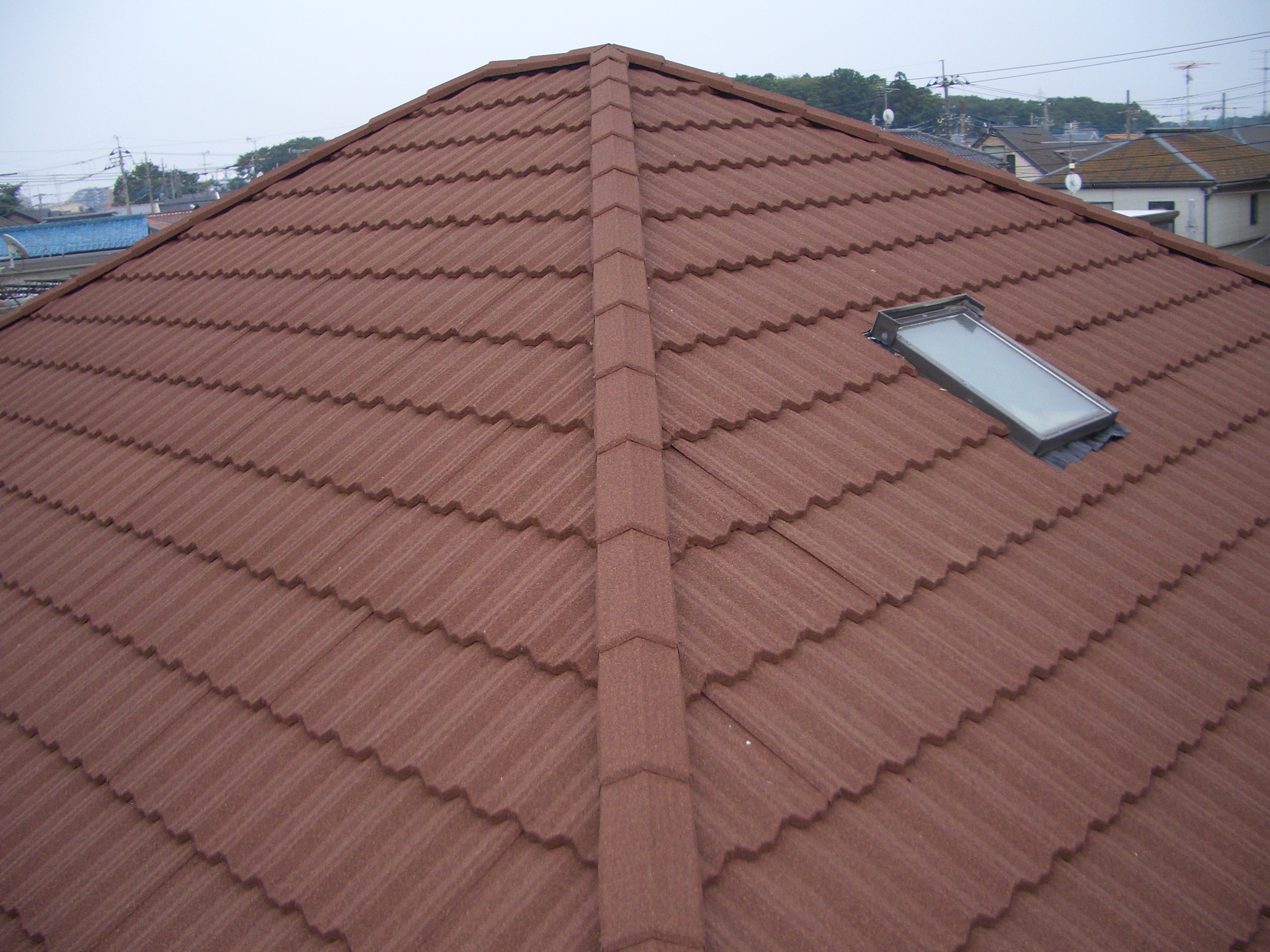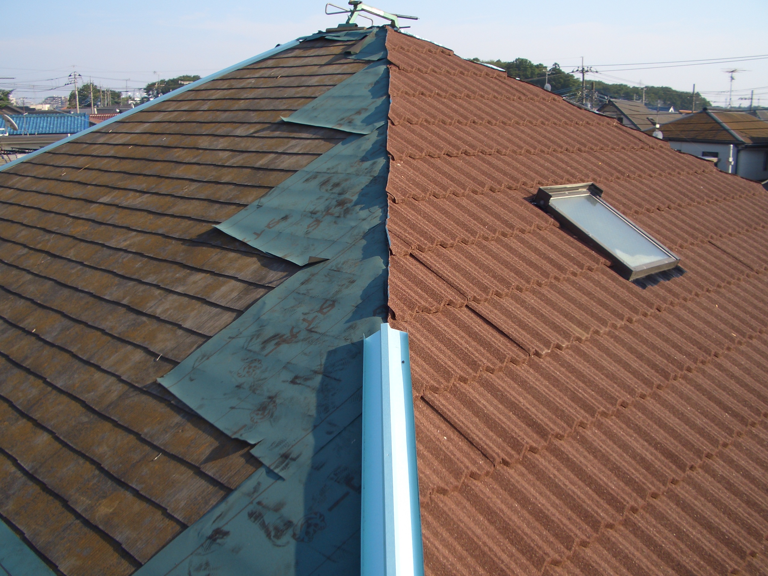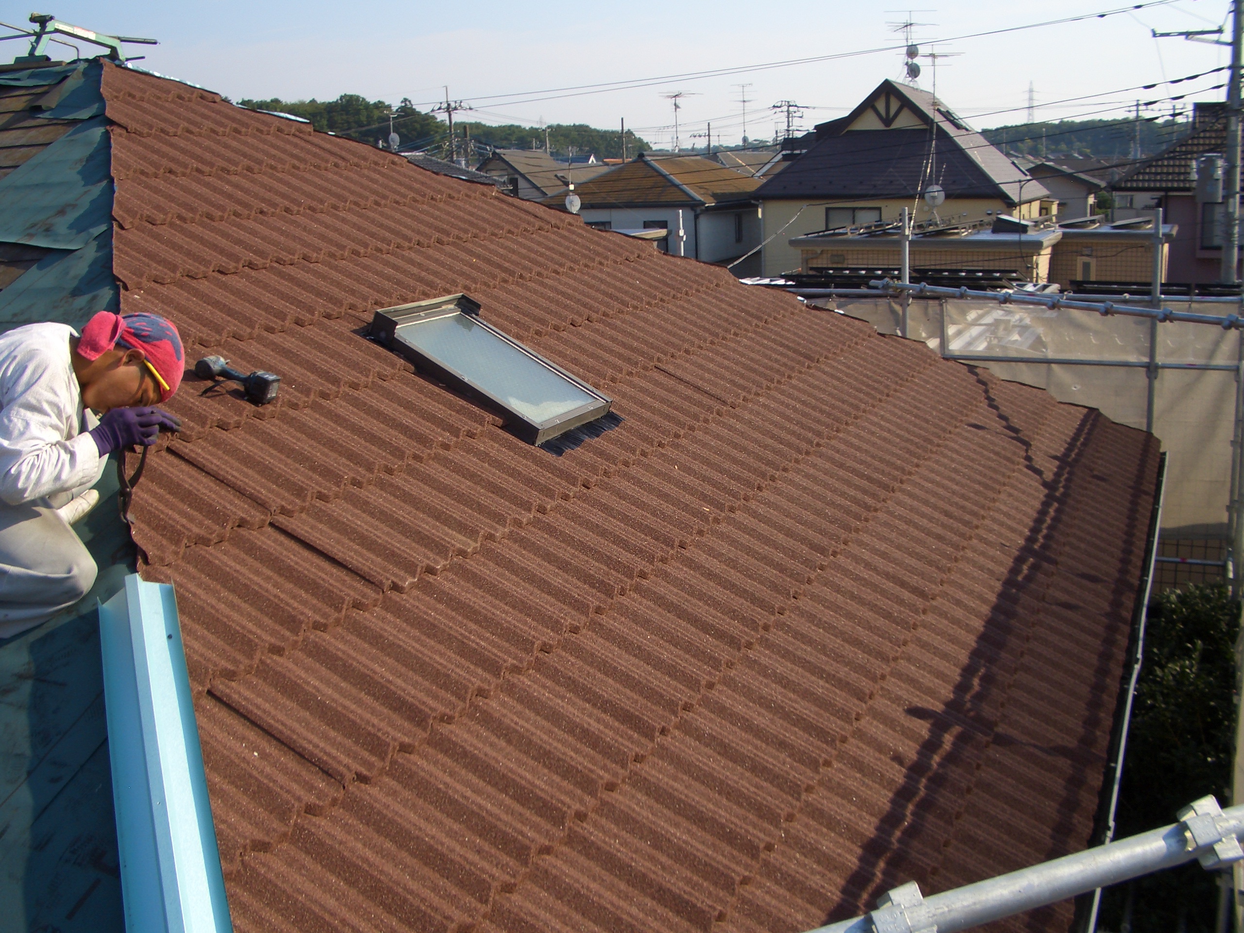 既存コロニアルに天然石付鋼板屋根(LIXIL社Tル-フ)カバ-工法施工