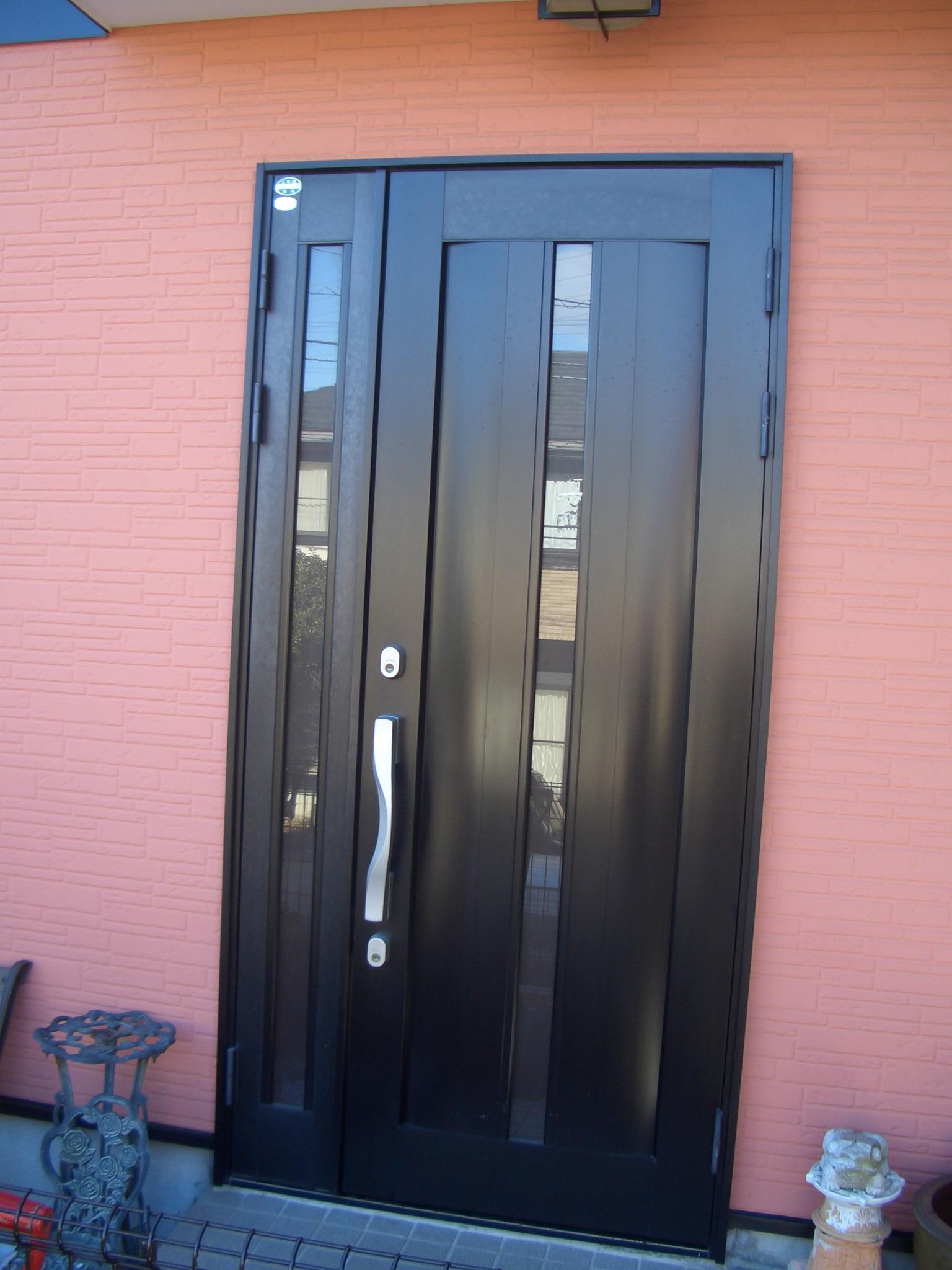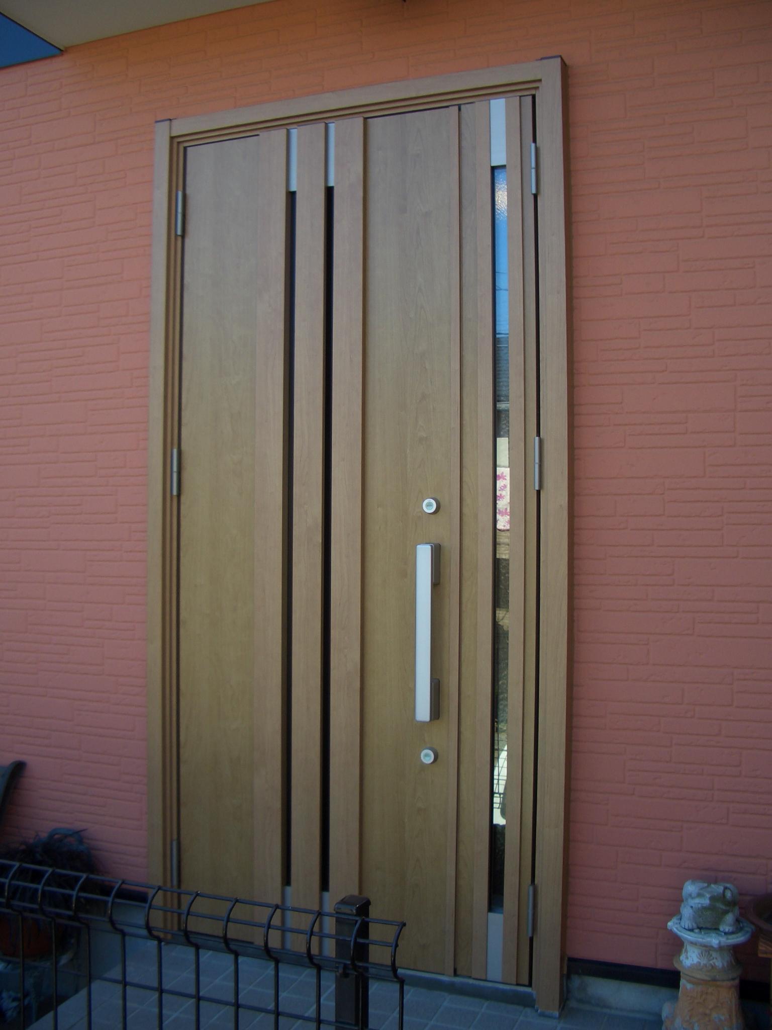 アルミブラック色から、今流行(はやり)の木目調に替えさせていただきました、やわらかい明るい木目調で外壁の色にも合い、断熱ドアにしたのでドアからの冷気も軽減されました。少しでも快適な生活を送られるご提案させていただきますのでお気軽にご相談ください。