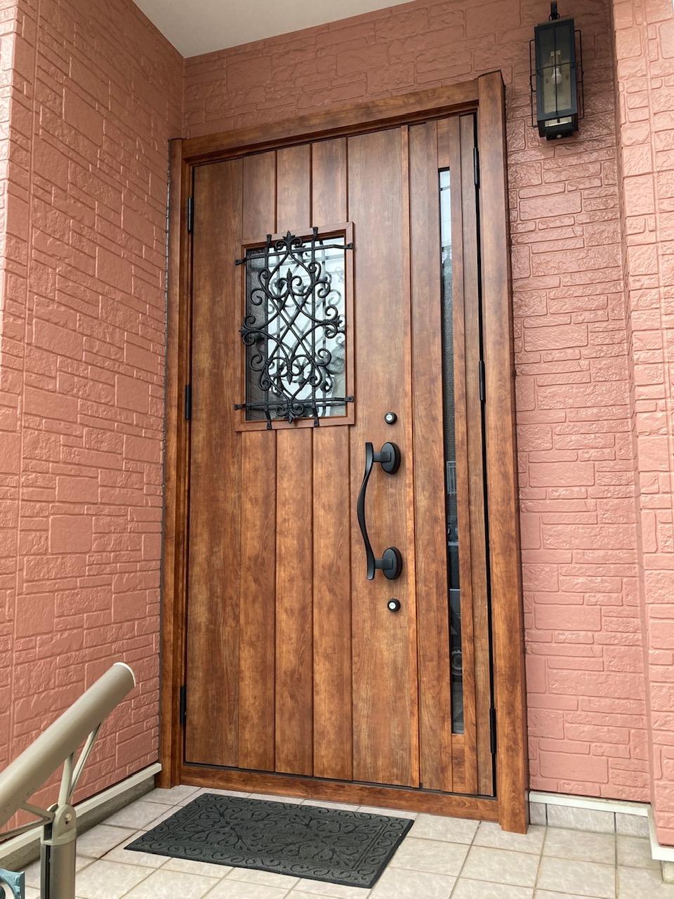 玄関ドアも時間が経つと色あせや、扉にさわると色が手に付き劣化もしてきます。玄関ドアを替えたいとお話を受け、外壁や内壁を壊さずに短期期間・低予算で工事が出来る〝リフォ-ム玄関「リシェント」〟をお薦め致しました。