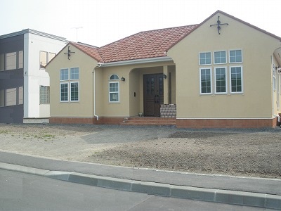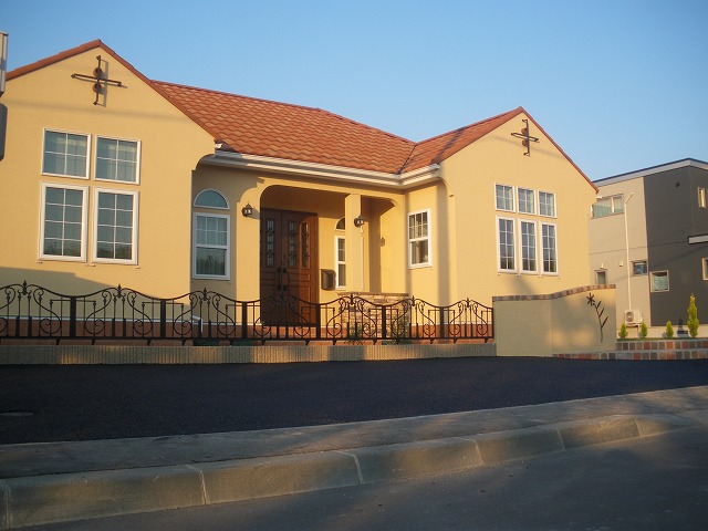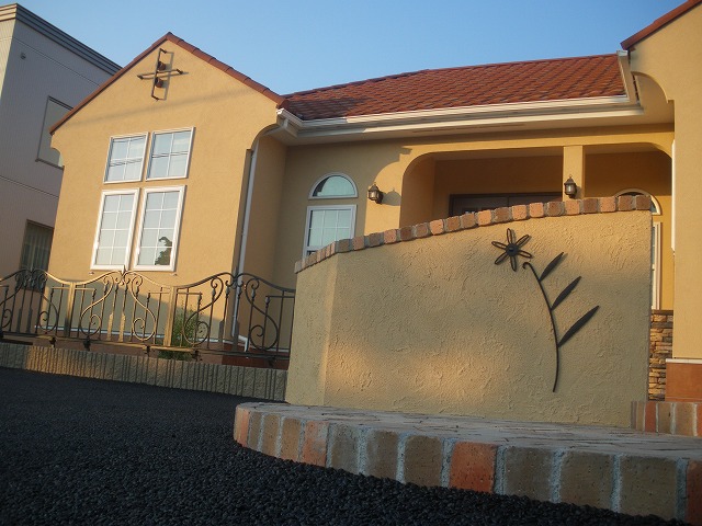 魅力的な塗り壁の平屋をさらに引き立てるガーデンエクステリアをご希望とのことで、アルミ鋳物フェンスで重厚感を出し、門まわりは建物と同じオメガアクロフレックスを使用しました。