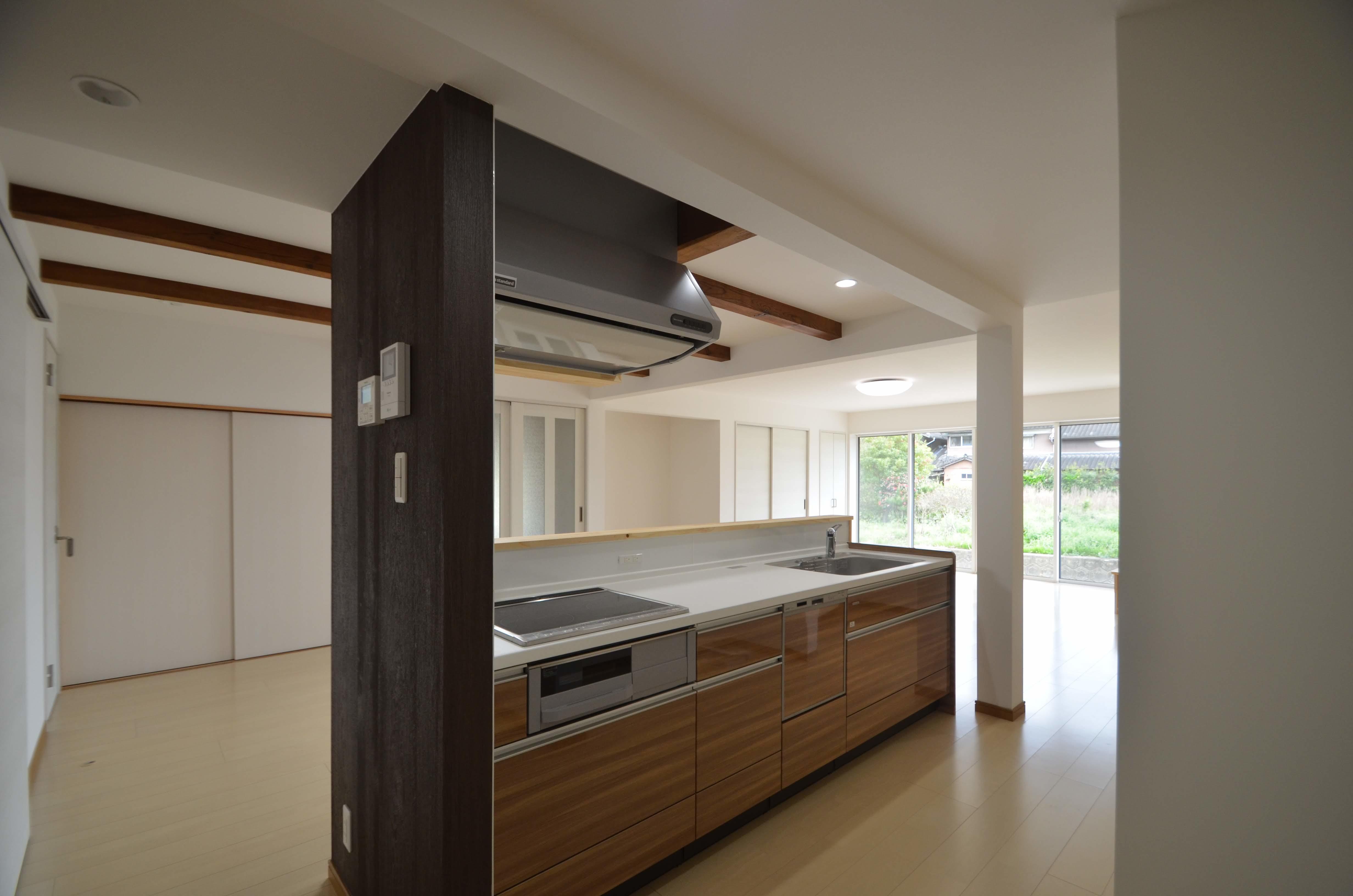 以前は昼間でも照明がないと暗かった2間続きの和室を一新。南側のおおきな断熱窓からキッチンまで、優しく太陽の光を運んでくれる、広々とした26帖の明るいLDKへ生まれ変わりました。キッチンに立てばLDKの隅々まで視界が届き、小さいお子様がどこで何をしているか、いつでも把握することが出来ます。新しく設置したキッチンは、オール電化でお掃除も楽々。火を使わないので家事の心配も少なくて済みます。収納がたくさん置けるスペースも確保してますので、食器や家事家電以外にも、趣味の物やかわいい小物もおいて頂けます。