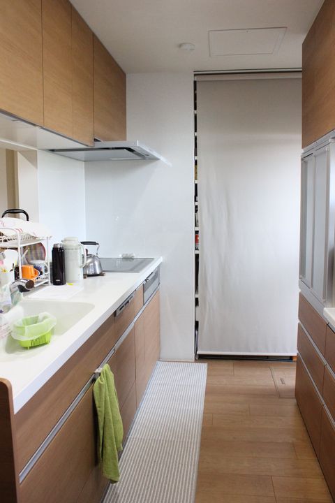 キッチンは対面式にし、大容量の背面収納を取り付けました。写真正面には、可動棚を設置し、天井までオープンのパントリーに。防汚加工のロールスクリーンを取り付けました。