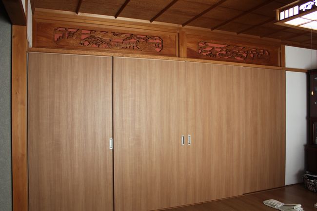 欄間と天井は既存のまま利用。元の襖の高さでは、背の高いご主人が不便なので加工をし、また開口部分を広くする為、両側に引き込める扉をオーダーしました。