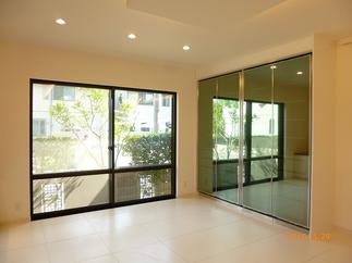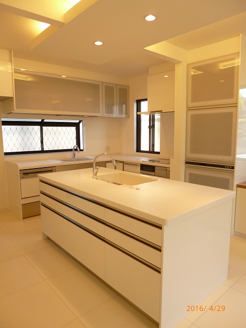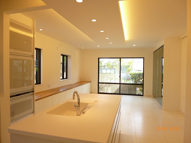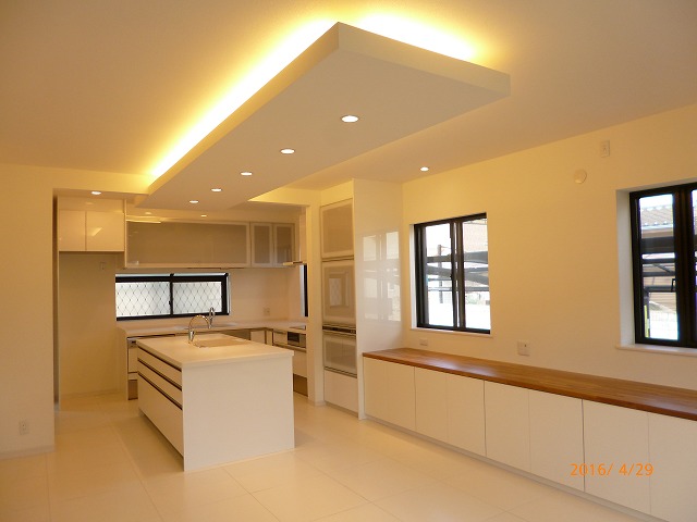 メインはキッチンのあるLDK。600角の大きな白いタイルの上にはL型とアイランドを組み合わせたキッチン。全体を白でまとめる事により空間を広くイメージ出来るのですが、それだけだと返って殺風景。それを解消する為にキッチン上部に間接照明を兼ねた下がり壁を作る事で丁度良い空間のバランスが取れ、設計者の意図通りの施工になったと思います。