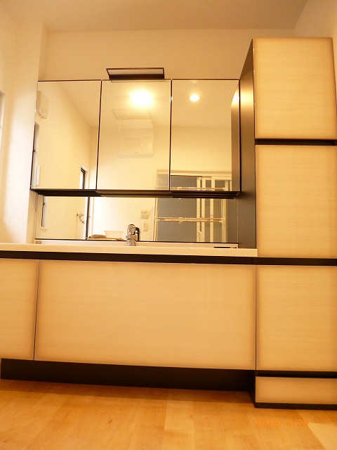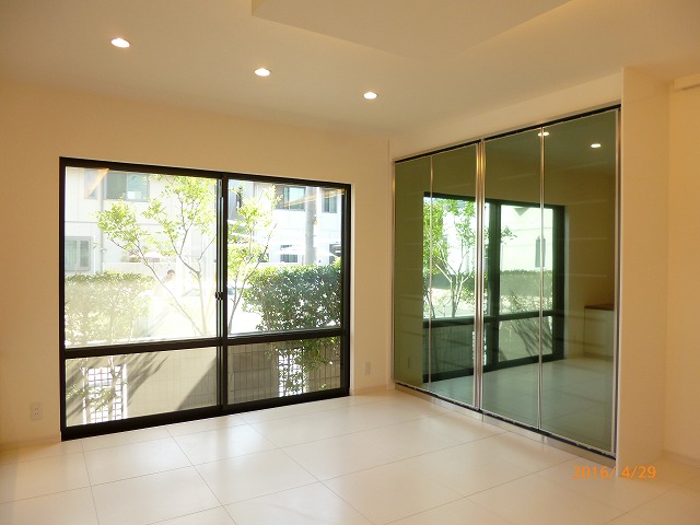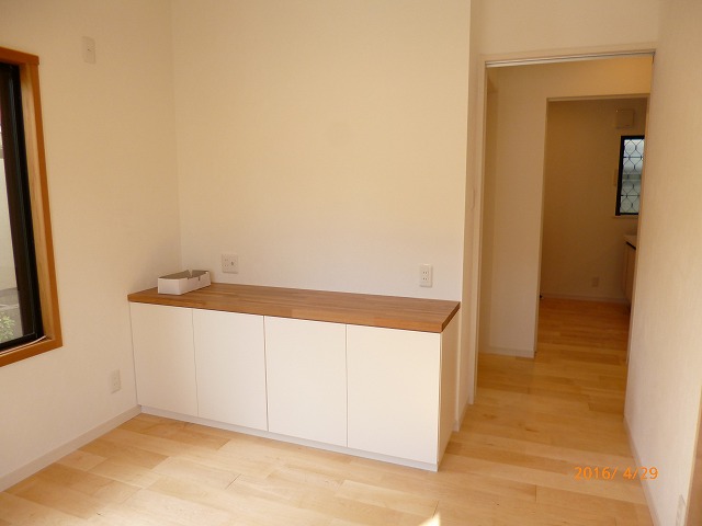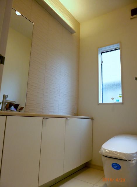 元々の和室には床にメープルを貼り柔らかい洋室に!床にはLDKと同じ600角のタイルを貼り手洗いカウンター上部にはエコカラット、間接照明を取り付ける事で広いトイレのバランスが良くなりました!