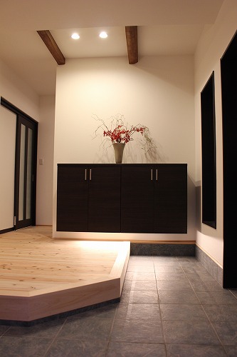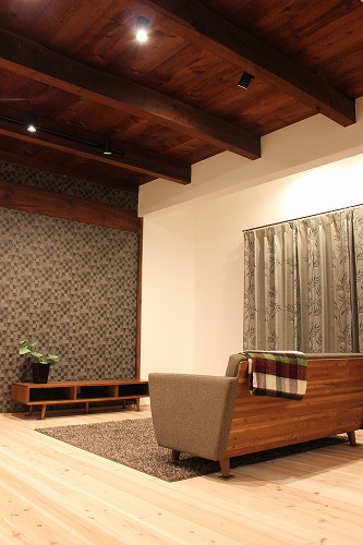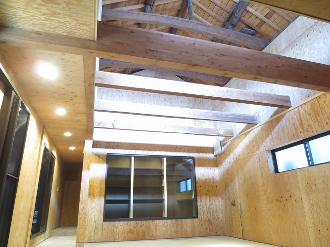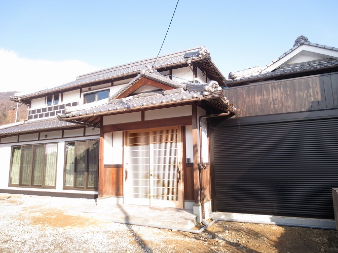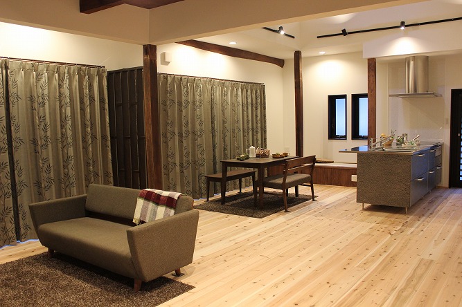 数年間空き家となっていた築80年の祖父の家をお孫さん夫婦が譲り受け、永遠の住み家としてリフォームを決意。当初は新築も検討されていましたが、たくさんの思い出が詰まったお家を受け継いでいきたい、古き良きものを残していきたいというご夫婦の強い想いがありました。外観はできる限り現状を活かし、梁や柱はあえて魅せ、床板はベンチに、水琴窟(すいきんくつ)は坪庭のオブジェに、ガイシは帽子掛けにするなど本当に様々な工夫とアイディアが満載。牛舎と茶室があった場所を補強して作ったビルトインガレージはご主人一番のこだわり。LDK