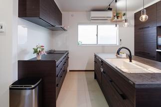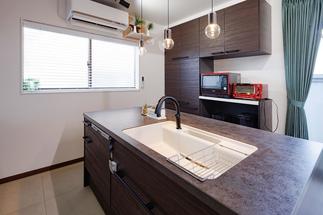 掃除がしやすいよう、アドバイザーの自宅で採用した高級感のある60cm角タイルを提案しました。リフォーム前は食器棚を2つ置いていたそうですが、収納力が高いキッチン・背面収納にすべて収められ、かつ余裕があるとのこと。奥様のご希望でIHはグリルレスを採用され、よりスッキリに。