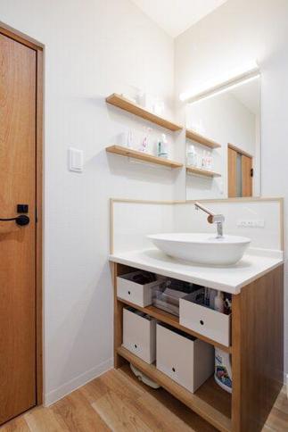 洗面は、コーキング処理の目立たないデザインにしたいというご主人のご要望があり、手洗い器の底が丸型の形であれば気にならないだろうとアドバイザーやコーディネーターの提案を生かした造作にしました。さらにカウンターやタオル掛けも造作し、とても使いやすいと満足されています。