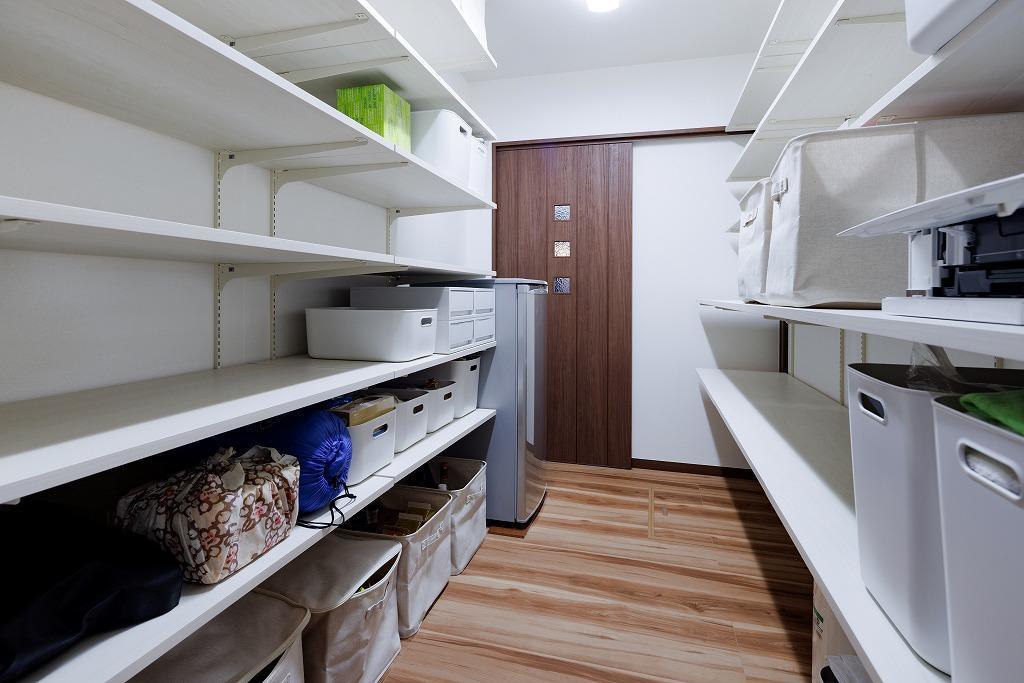 整理収納アドバイザーの資格を持つ奥様はその学びから収納力を上げたいとのパントリーを希望し、以前納戸だったスペースをパントリーに。広さがあるので両サイドに可動棚を設けても圧迫感なく収納量を上げられました。お気に入りの籠を少しずつ揃えて収納をしていらっしゃいますが、何個も何個も買ってもまだ余裕があると奥様。