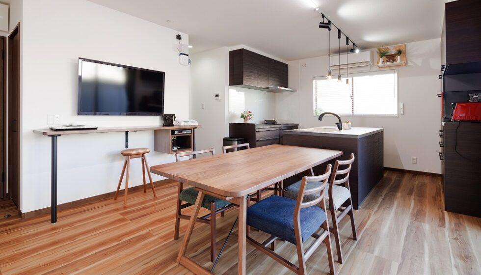 もともと壁付けだったキッチンを対面できるようにしたい、外を見ながら調理したいというご要望から、二列型を提案させていただきました。LIXILの「リシェルSI/センターキッチン2列型L1800」オープンタイプをダイニングテーブルと一直線に配置しています。上部の照明はご主人のこだわりで、キッチン上のライティングレールとテーブル上のライン照明を並べました。ダイニングのテレビ周りはチューナーや電話、インターネット機器など置かれたいものがたくさんあり、すっきり収納できるよう、造作のボックスで隠しながらまとめました。