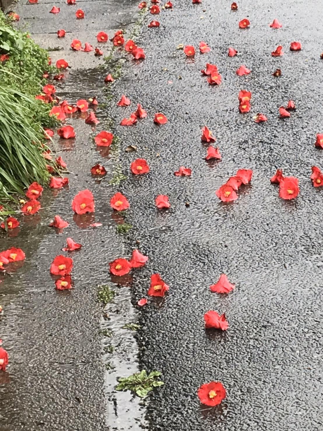 椿は花ごと落ち、さざんかは花びらが散ります。