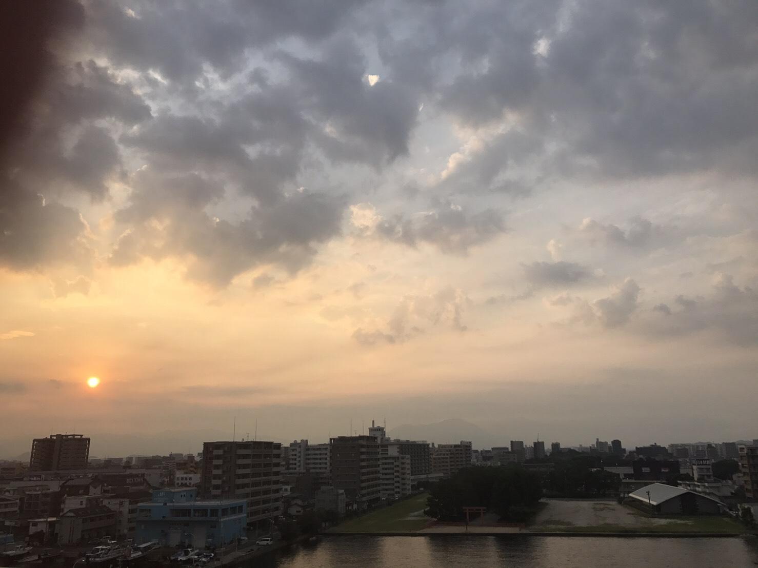 高い空の雲が薄く、遠くの空の厚い雲の中に沈んでいく夕日が幻想的です。