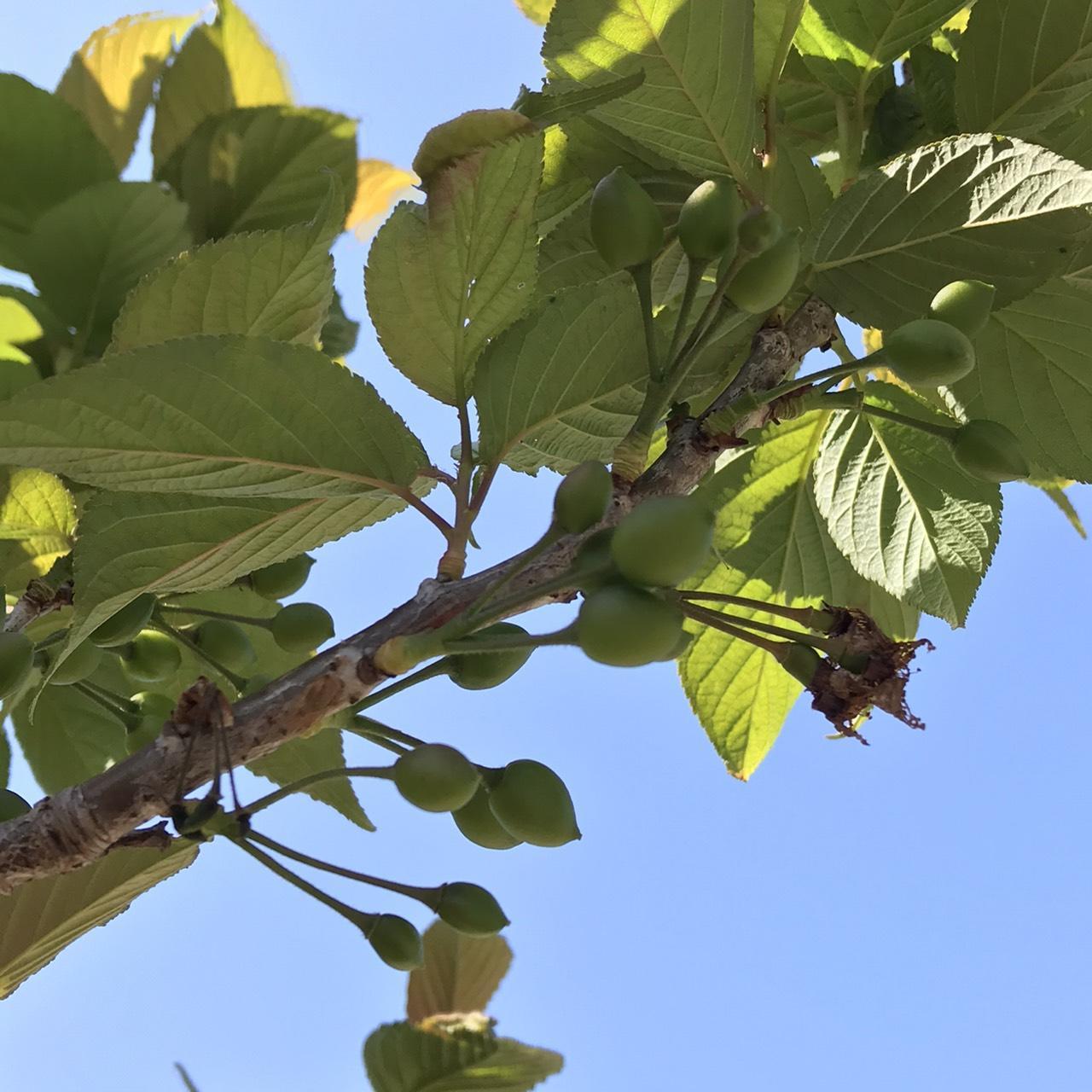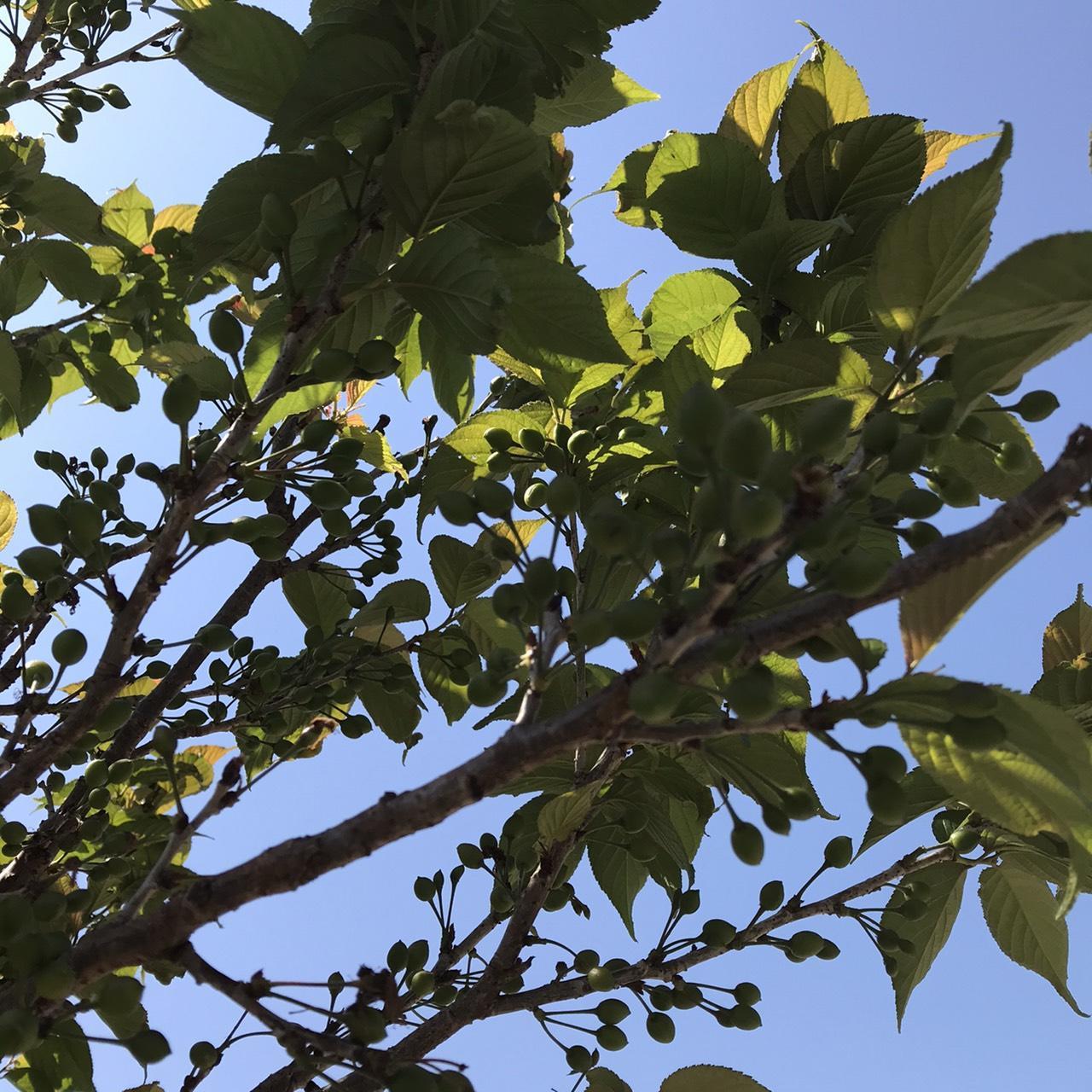淡いピンク色の満開だった花は散り、青々と葉が茂る中、たくさんの実がなっていますね。