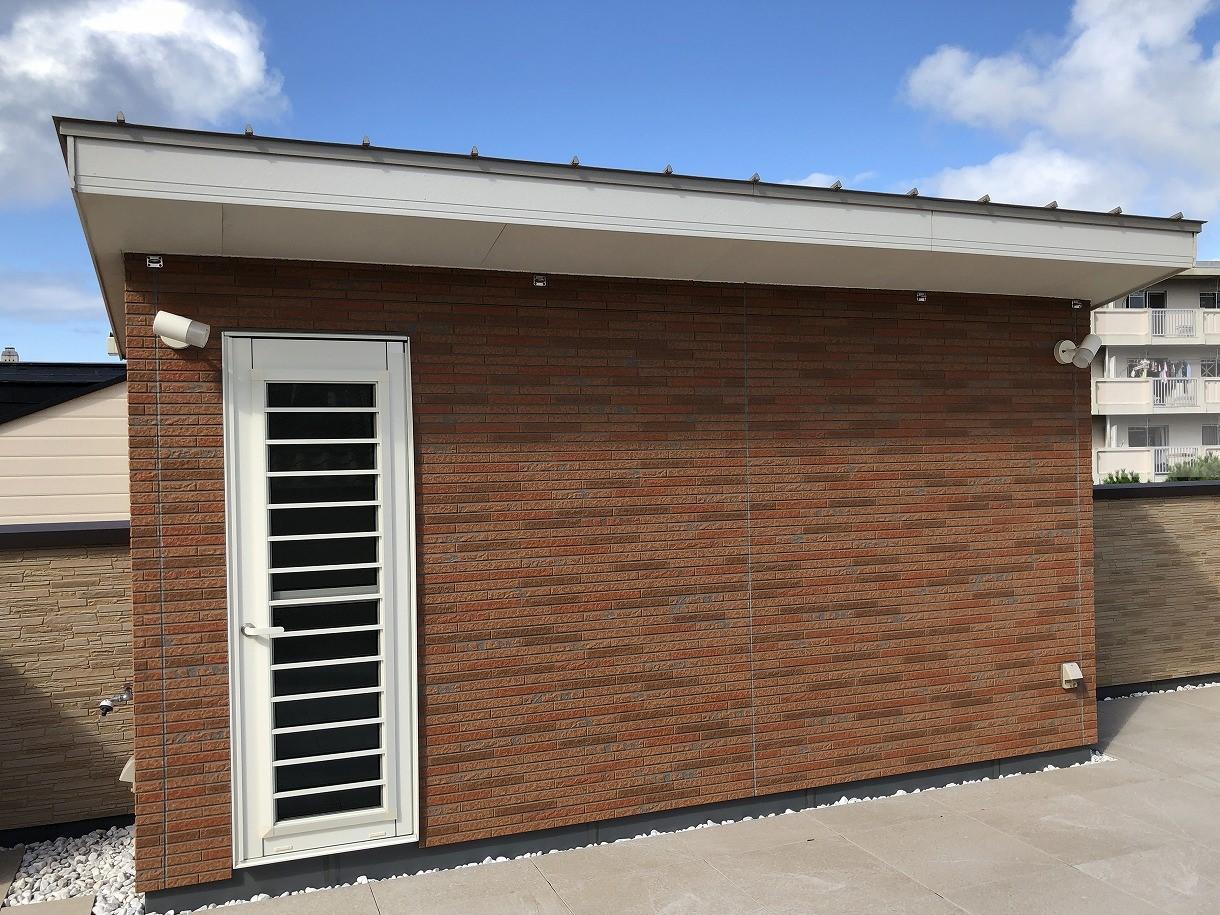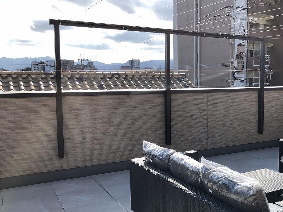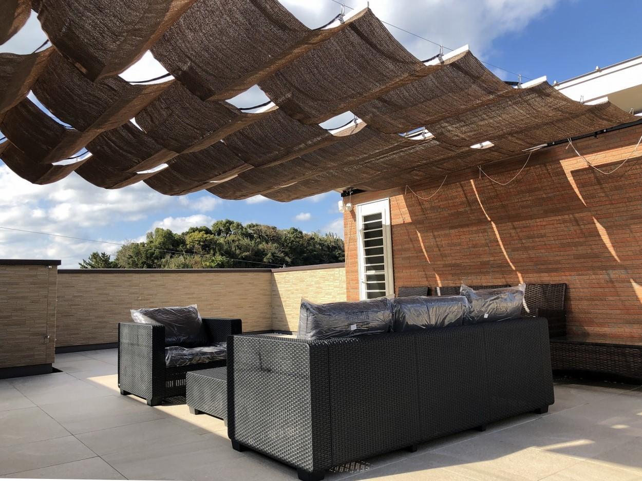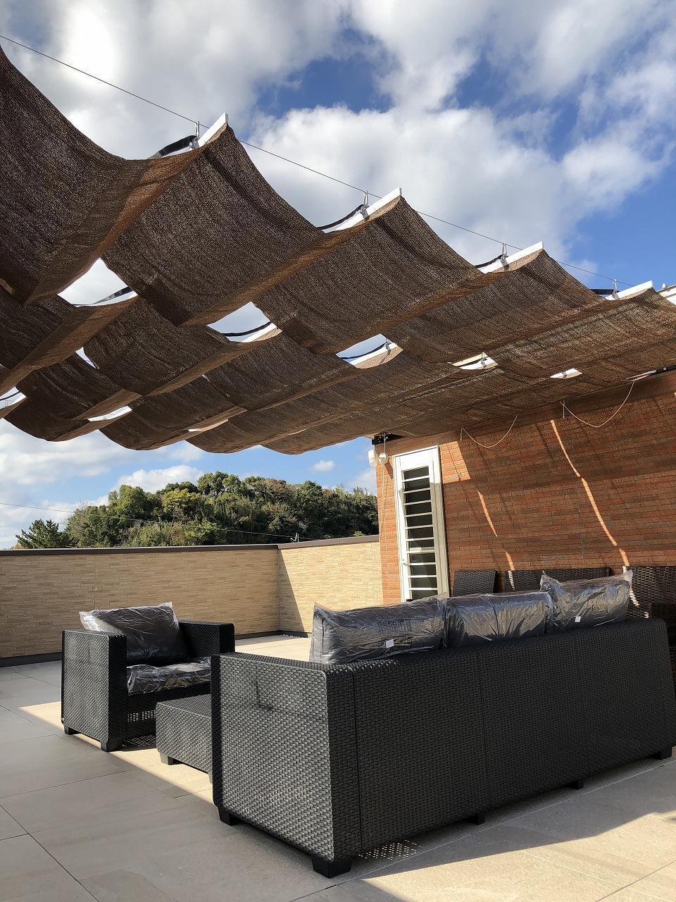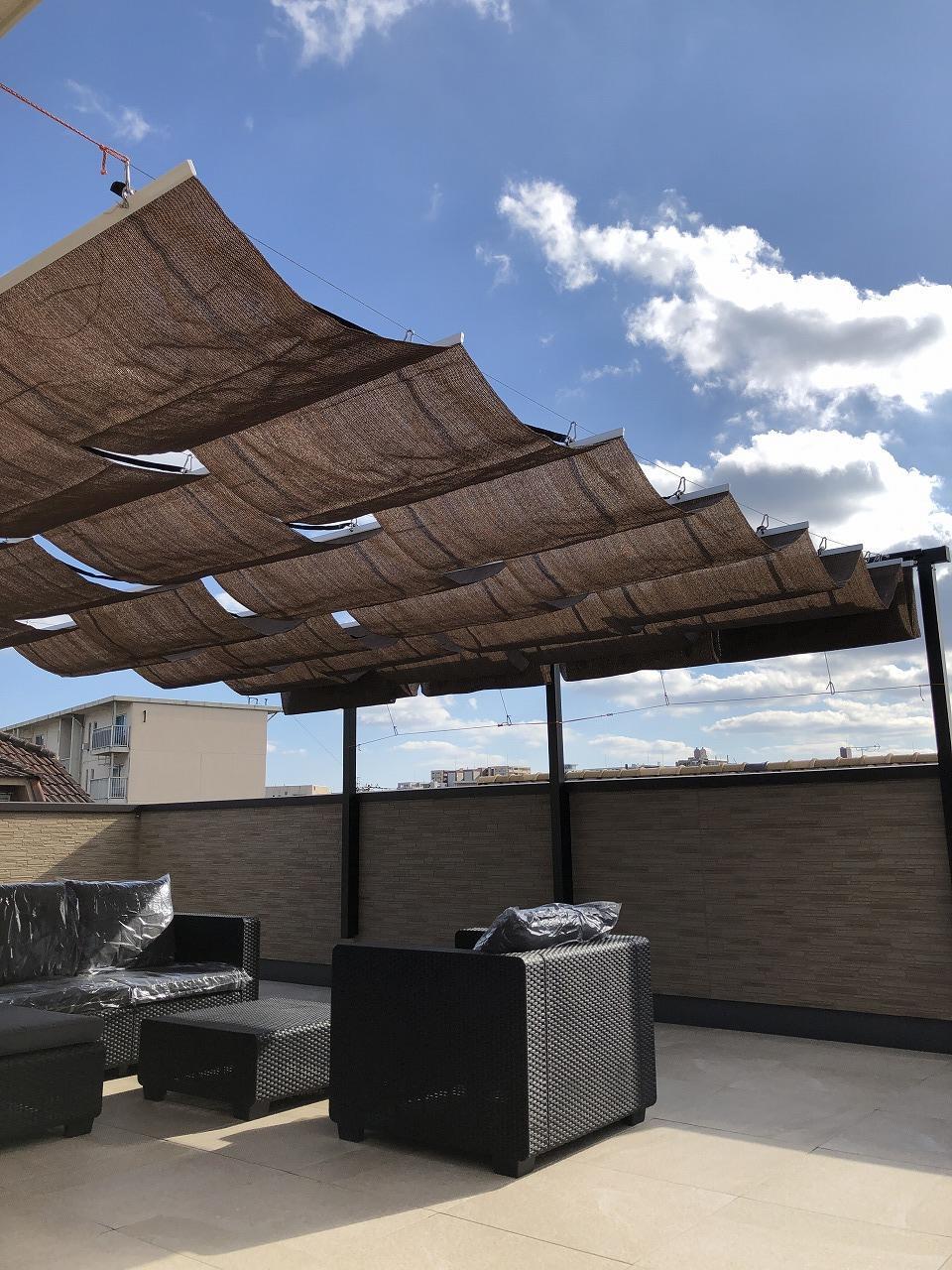 屋上の塔屋とパラペットにシェード受けを取り付け、開閉式のシェードを設置しました。