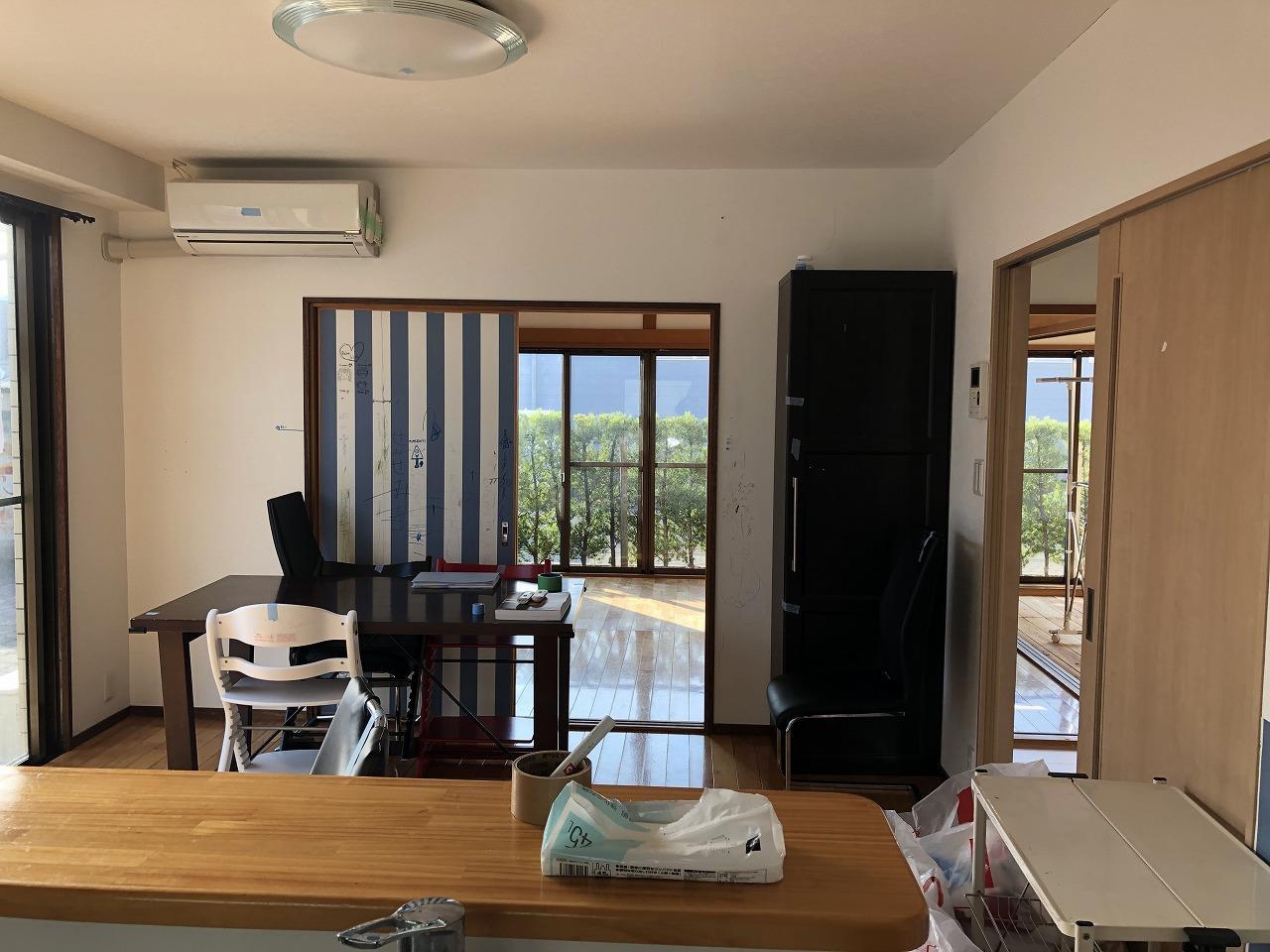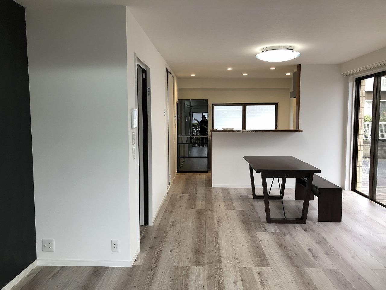 ダイニングとリビングの間仕切り壁を撤去したことで、キッチンからリビングが見渡せる風と光の通る広々としたLDKに。