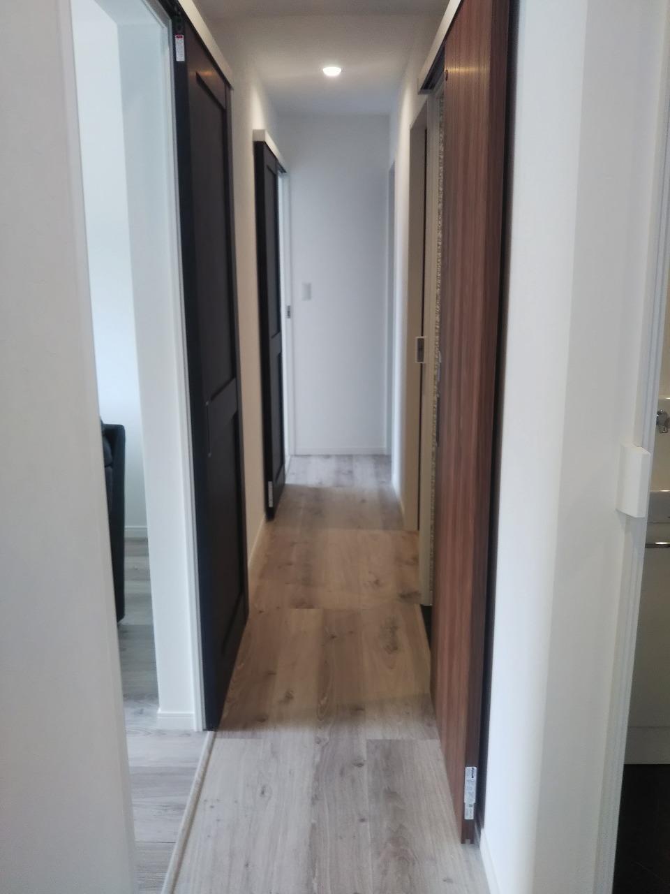 部屋の中央に位置する廊下を移動することで洗面室を広くし、シューズクロークと2か所のトイレスペースを確保し、必要な場所に必要な設備や収納を設けることができました。