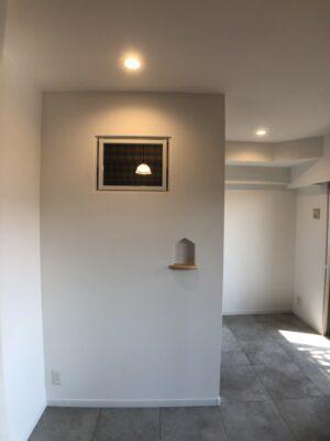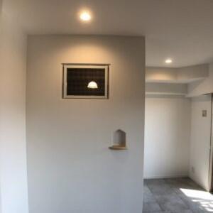 LDK側から室内窓をのぞくと格子柄のクロスと照明がみえるとても可愛く素敵なスペースになりました。