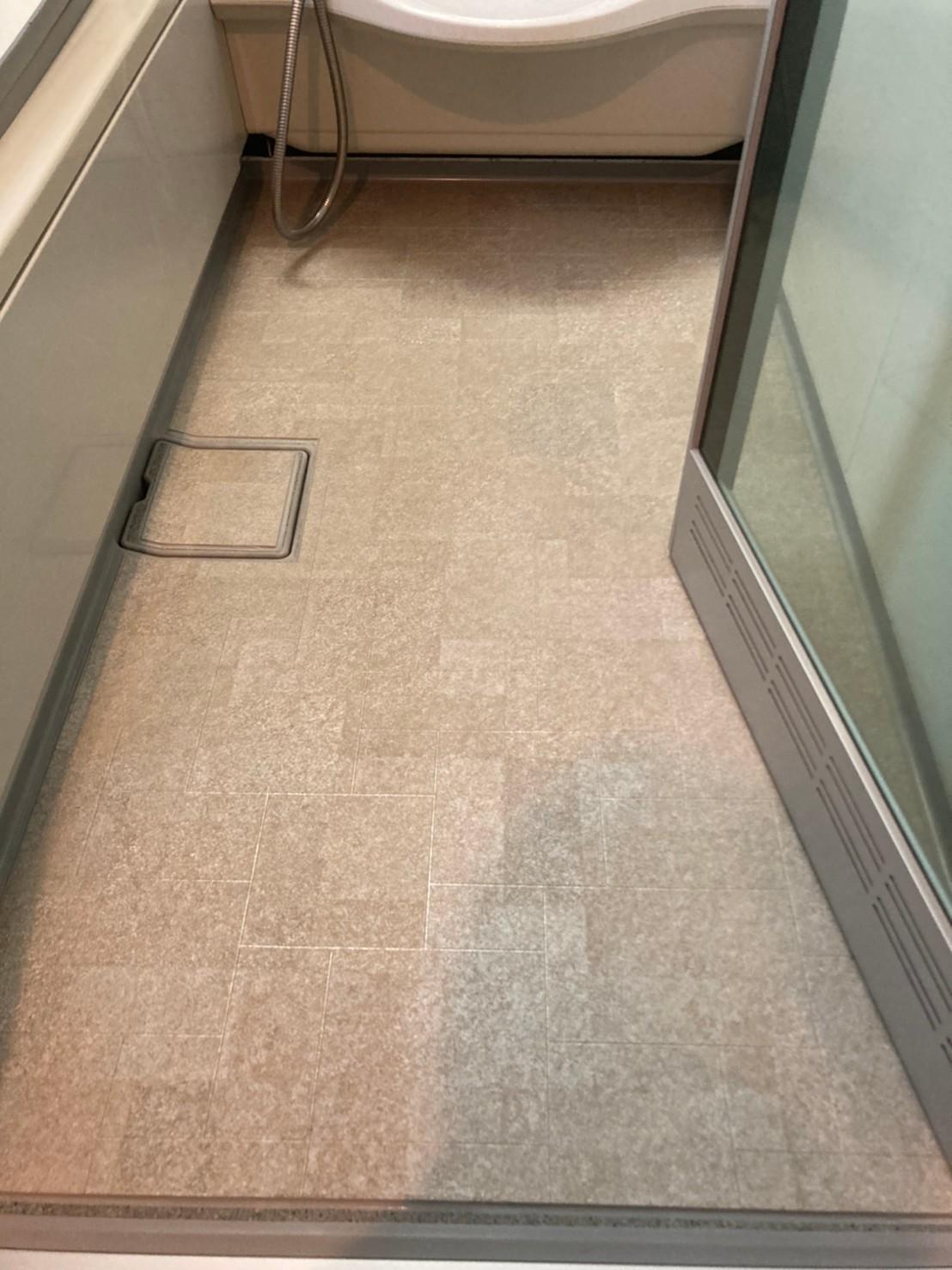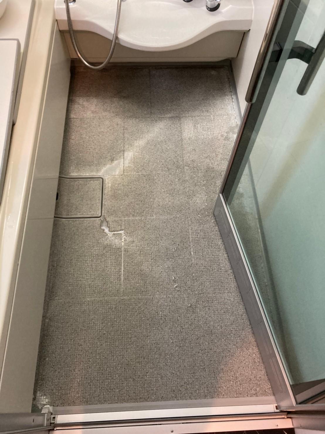床材部分が劣化し色落ちが目立ってきた様子。 他の浴槽などはまだまだ使えるので、ここで一式交換はもったいない!というお声から床材のみの交換をご提案させていただきました。