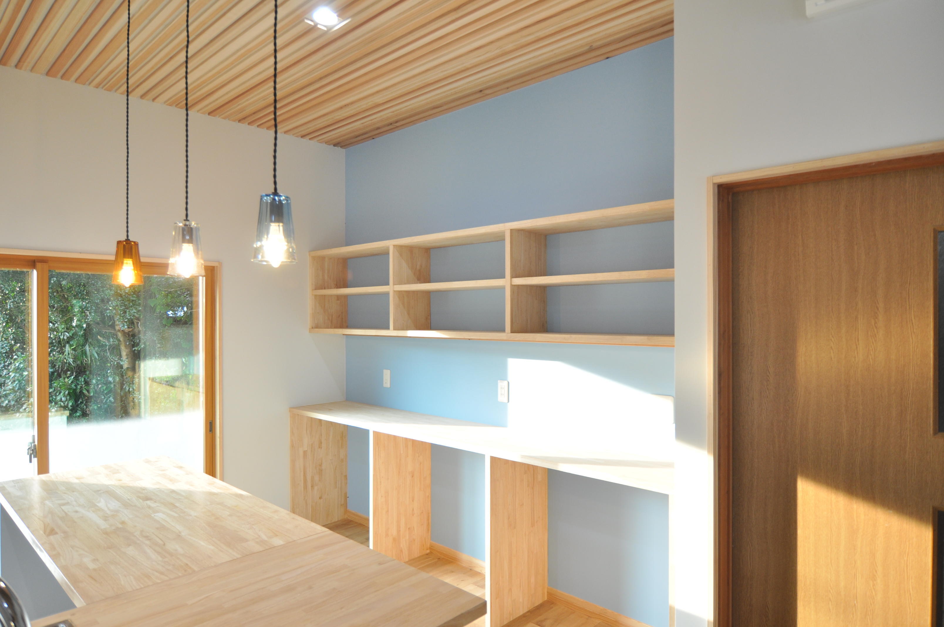 和室の居間からフローリングへ。キッチン〜リビングが一体となり、広々空間を実現しました。普段使いの小物から、書籍、雑誌、Blu-ray、DVDなども収納可能な大きめのボードを造作しました。