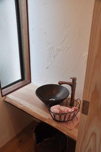 手洗いも和モダンに仕上がりました。壁は漆喰で仕上げ、トイレの嫌なニオイも解消!