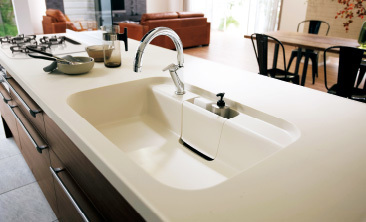木目扉や濃色扉では、シンクとコンロをワークトップと同色系で馴染ませると、