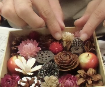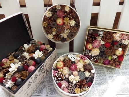 松ぼっくりや木の実をぎゅっと詰め込んで、飾ってもプレゼントにも可愛いアレンジを作りませんか?