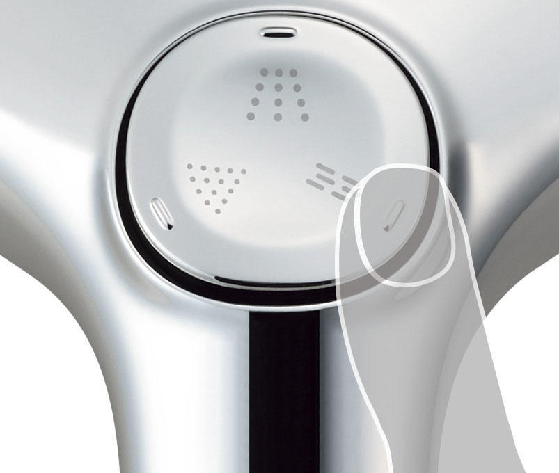 3つの吐水モードは背面のマルチスイッチで簡単に切り替えられ、さらに手元のスイッチ付きはワンプッシュで吐水、止水の切替えができます。