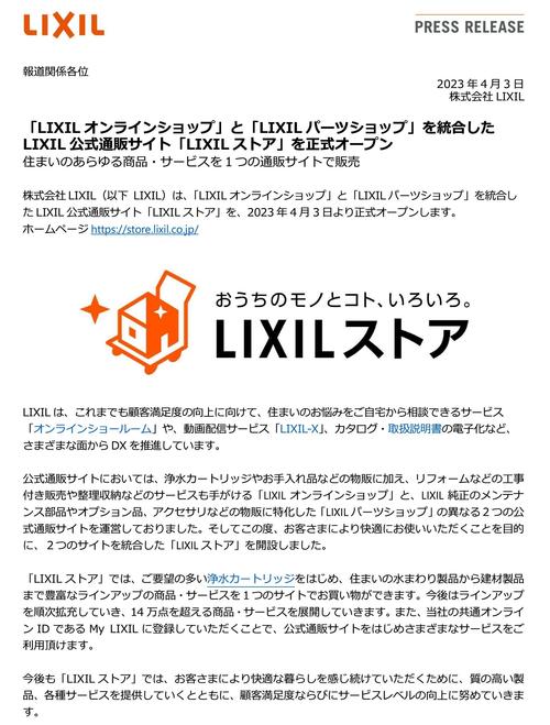「LIXILオンラインショップ」と「LIXILパーツショップ」を統合した LIXIL公式通販サイト「LIXILストア」を正式オープン!