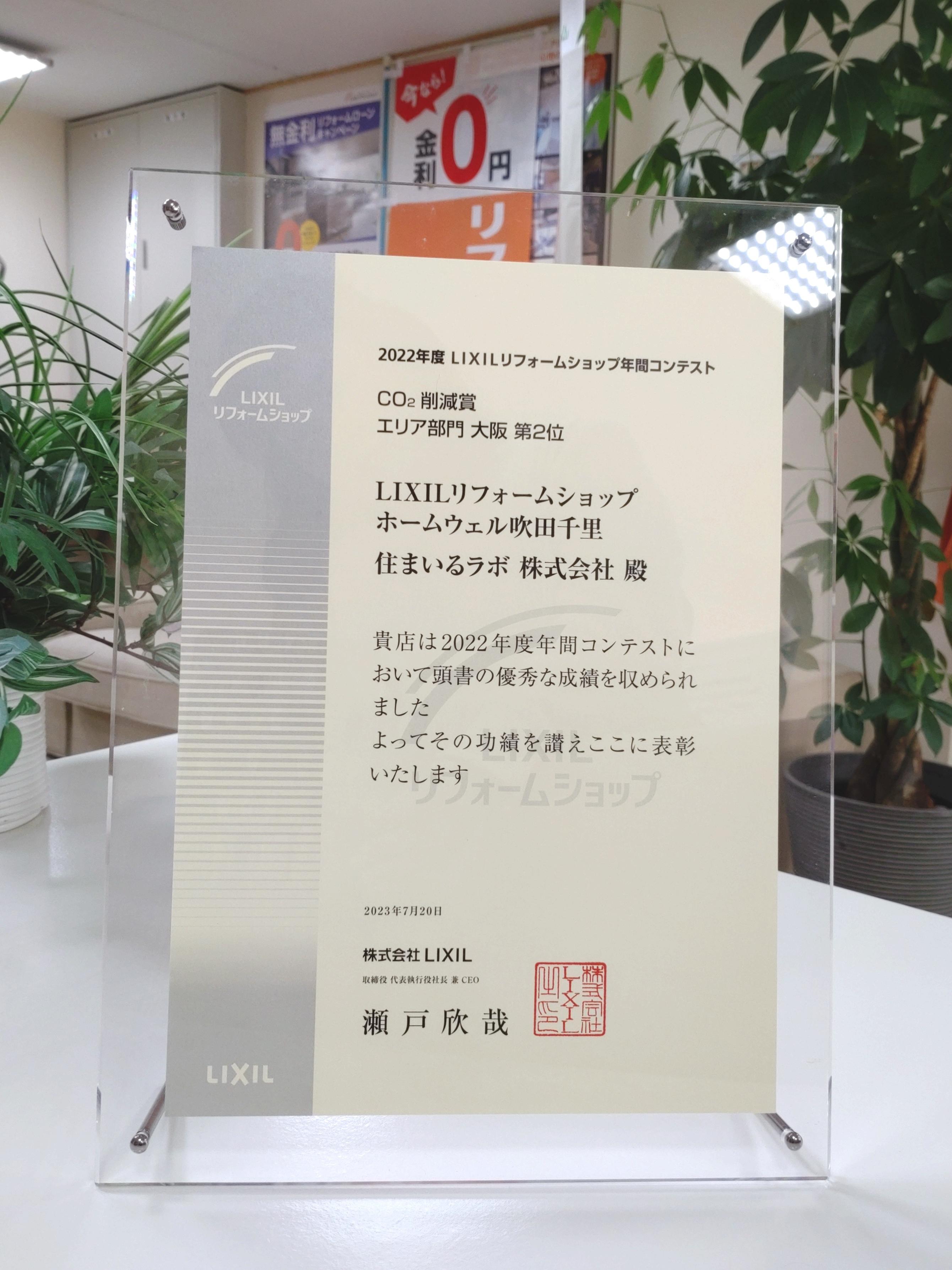 LIXIL 年間コンテストにおいて、『CO2削減賞 エリア部門 大阪 第2位』を受賞しました。