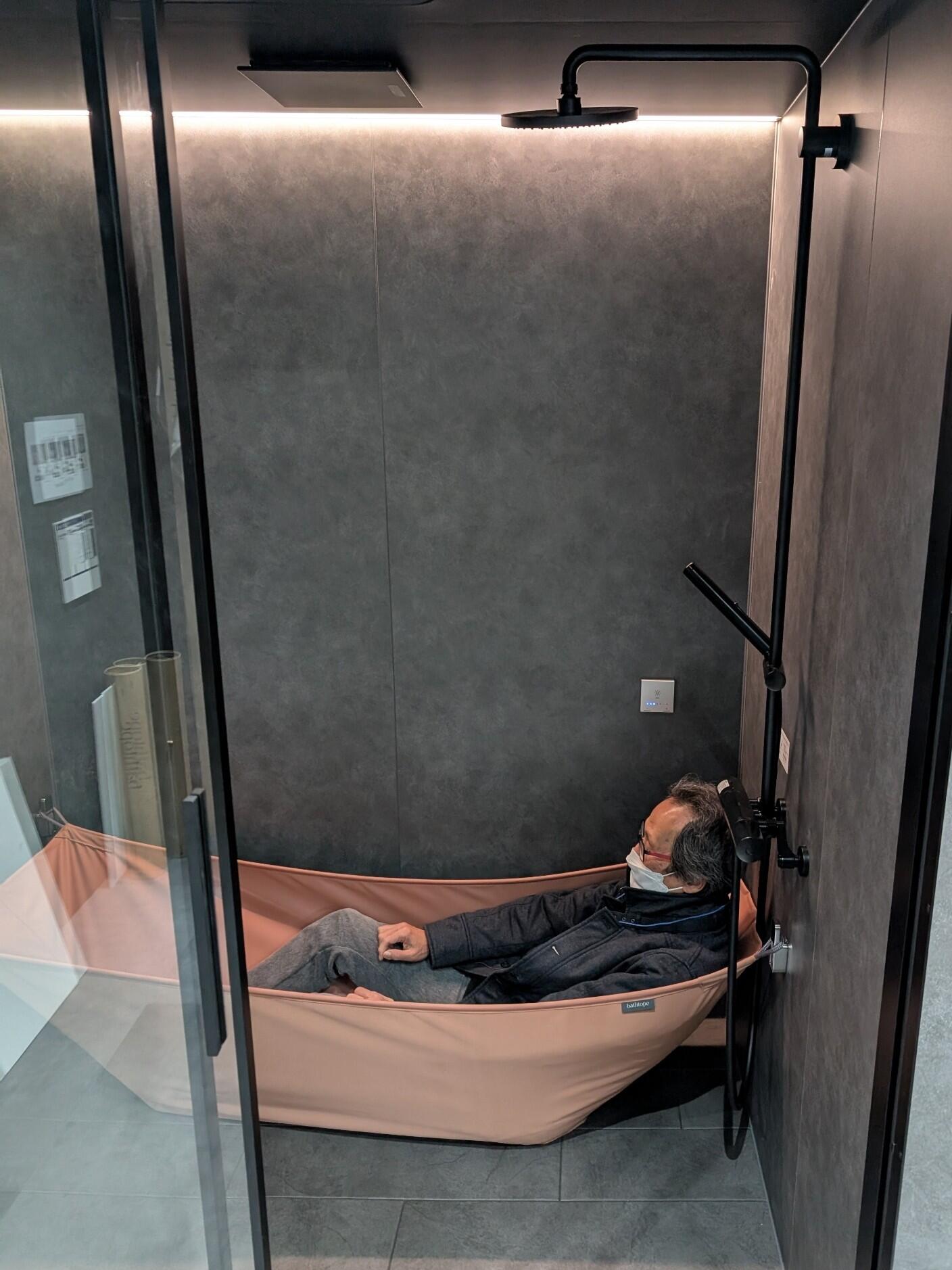 fabric bath は、従来の浴槽とは違い、柔らかく肌触りの良いシートで作られています。