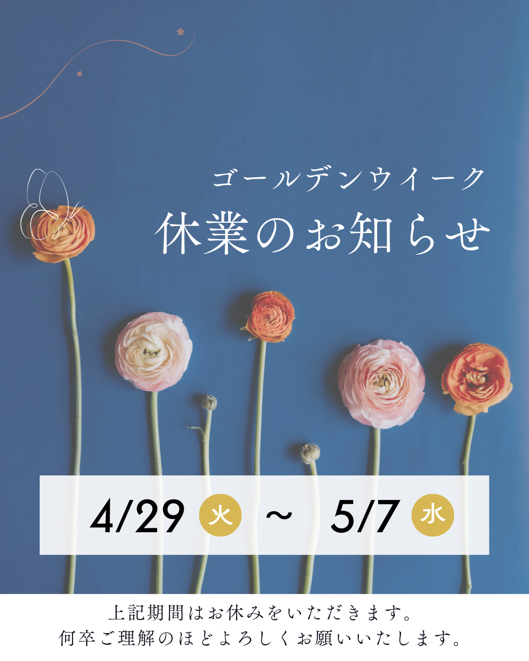 みなさま、どうぞ素敵なゴールデンウィークをお過ごしください。