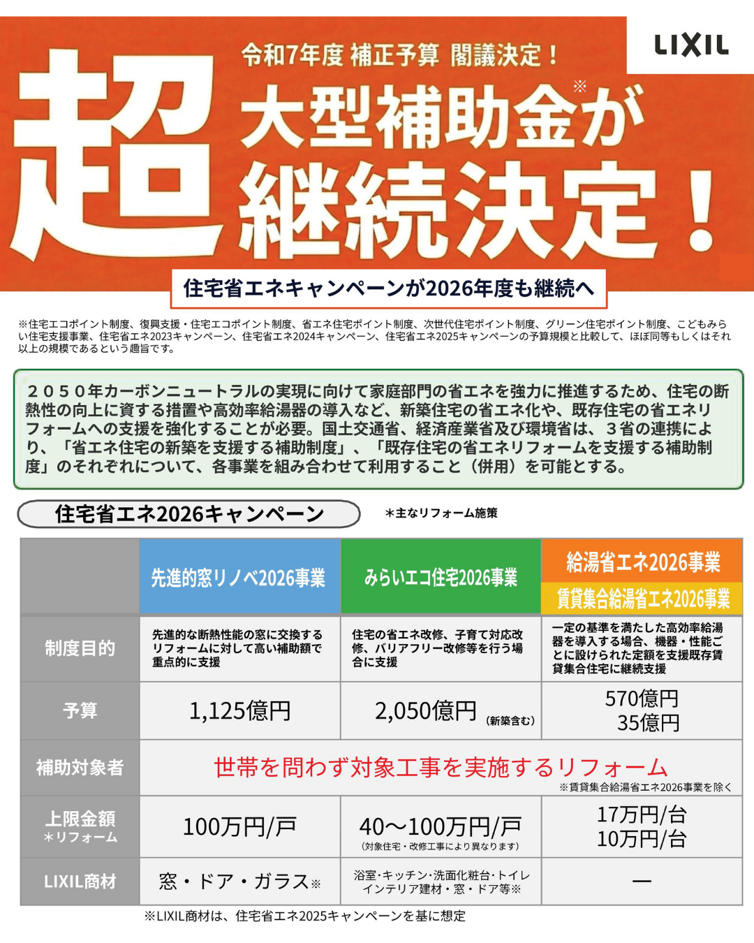 このたび、令和7年度の補正予算案が閣議決定され、『住宅省エネキャンペーン(住宅省エネ2026)』 の継続が盛り込まれました!