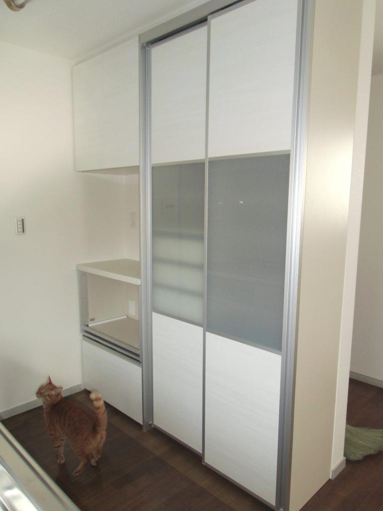 背面にはキッチンと揃えて、スライディングドアストッカーで大容量の収納を。