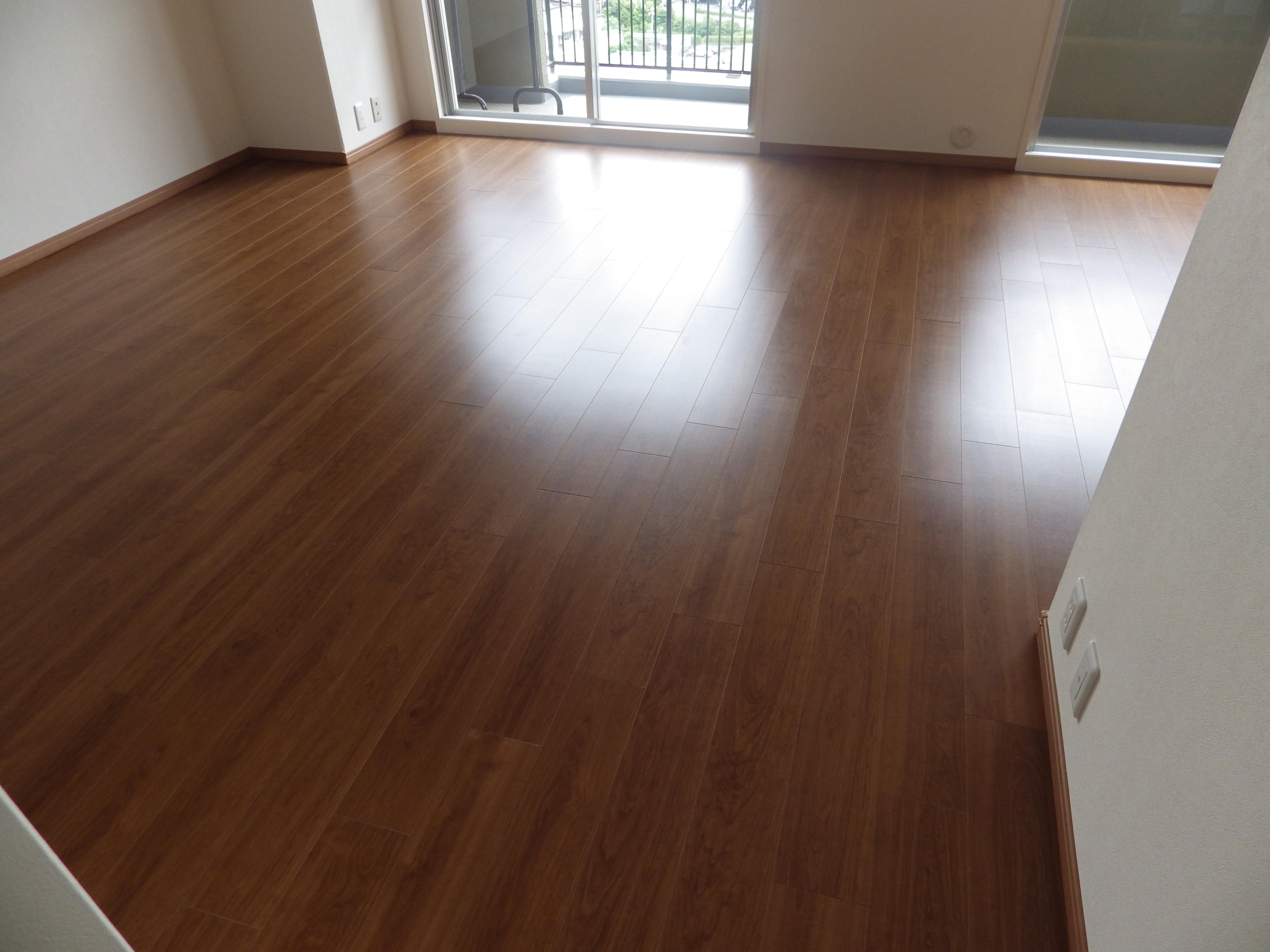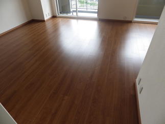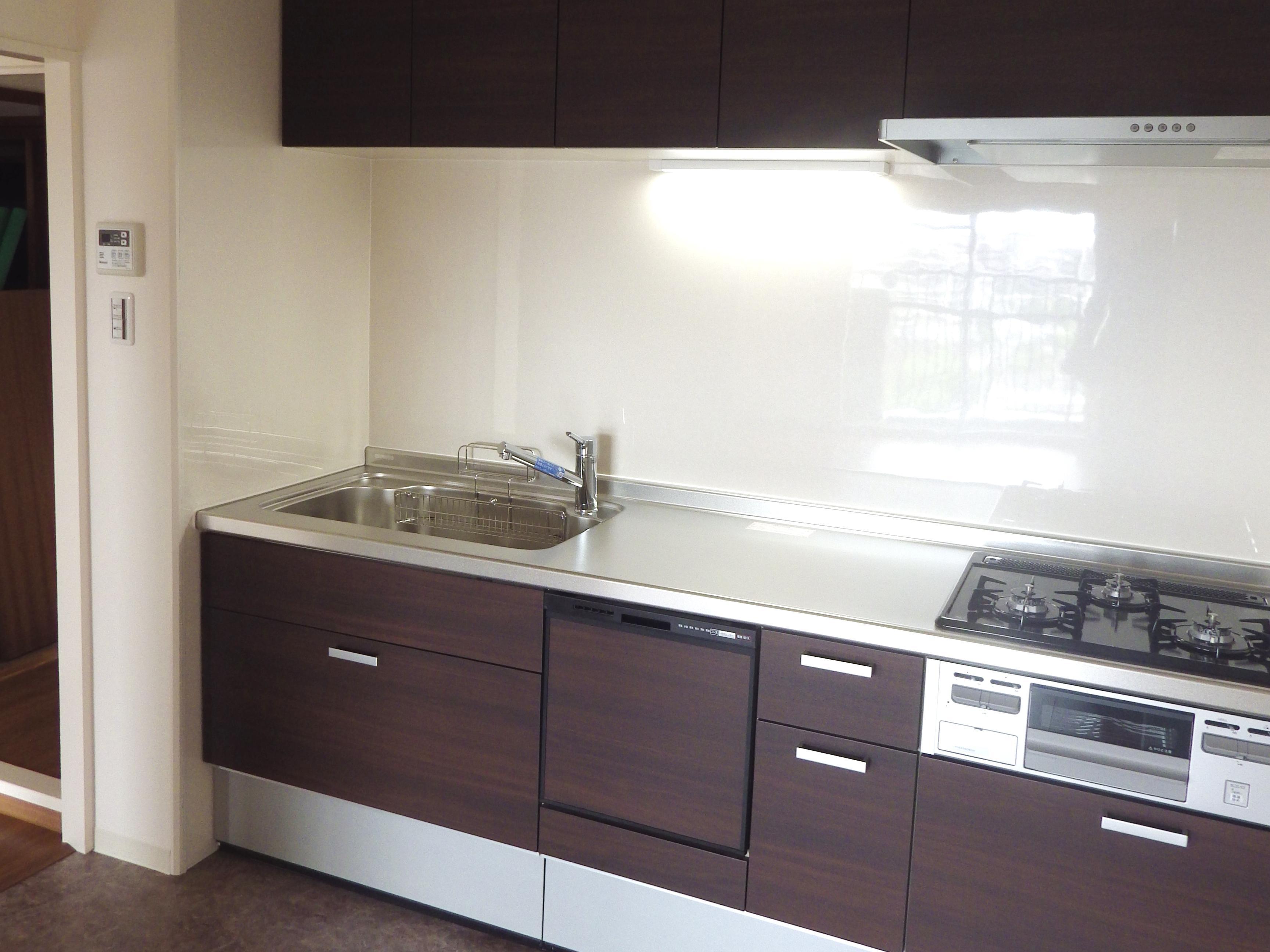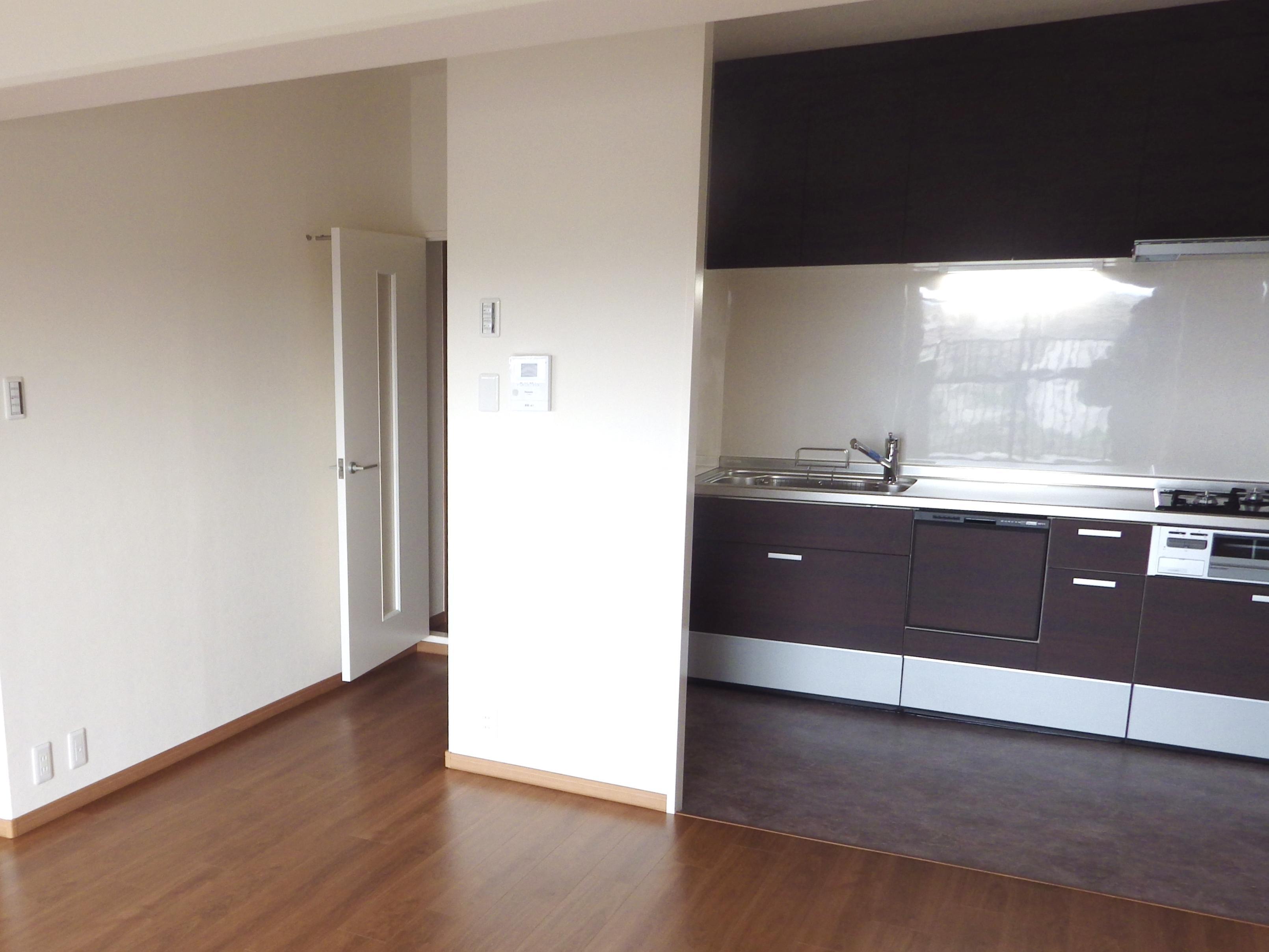 古くなった水回りの設備を交換し、壁紙・床・建具も張替えてすっきりリフレッシュ!心地よく暮らせます。クロスはホワイトが基調で、 床のチェリー色とキッチンのディープウォルナットと濃い色を採用し、落ち着いた雰囲気のお住まいになりました。