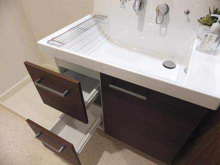 広い洗面ボウルが使いやすい。【洗面化粧台:LIXIL ピアラ 扉カラー:クリエモカ】