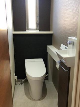 1階は、グレイッシュなブラウンの“ノーブルトープ”のLIXILサティスGを選び、グレーの壁紙とピンクのエコカラット、カウンター、ステンレスの手洗い器でコーディネート。 カフェのトイレのような上品でオシャレな空間になりました。