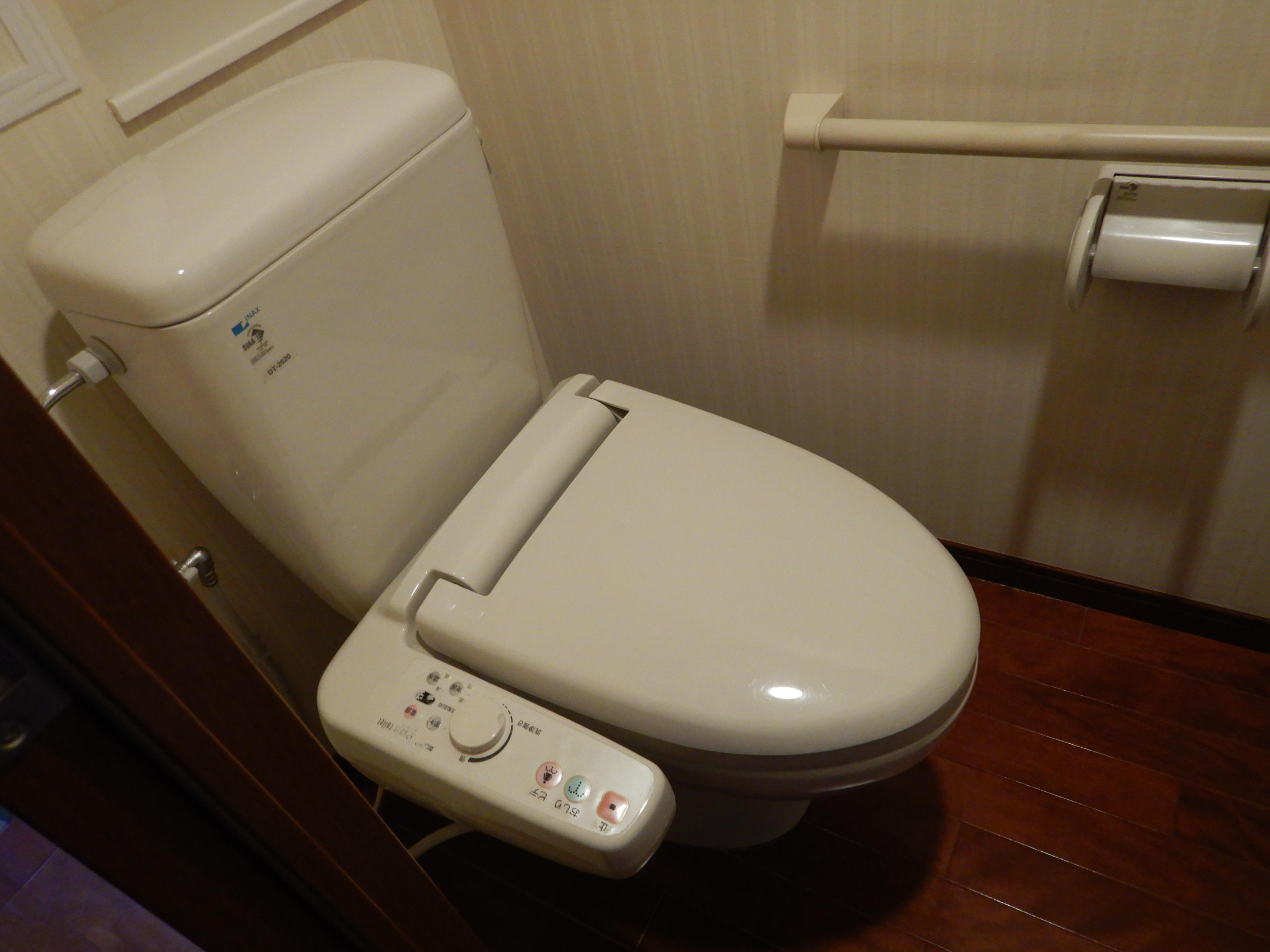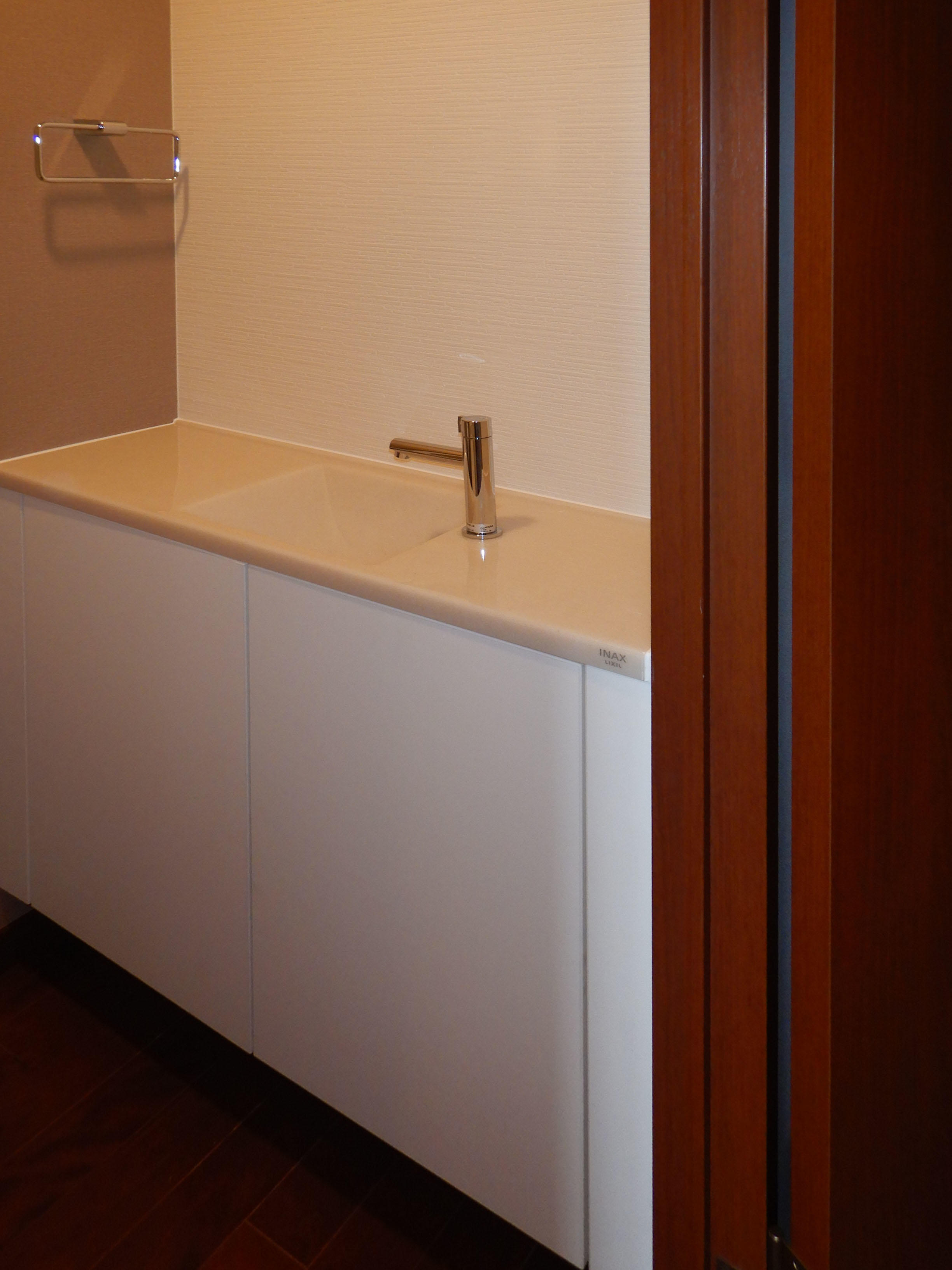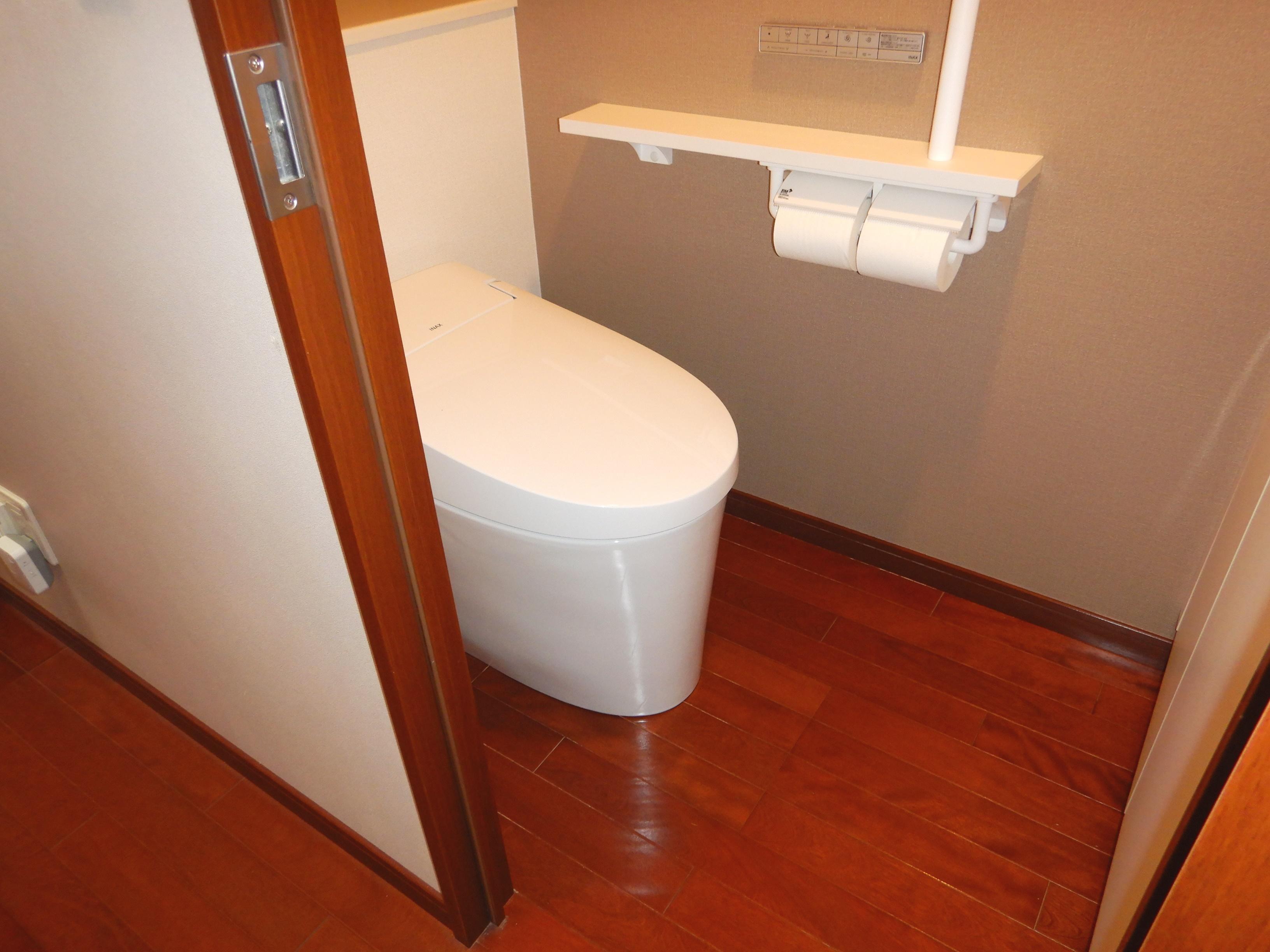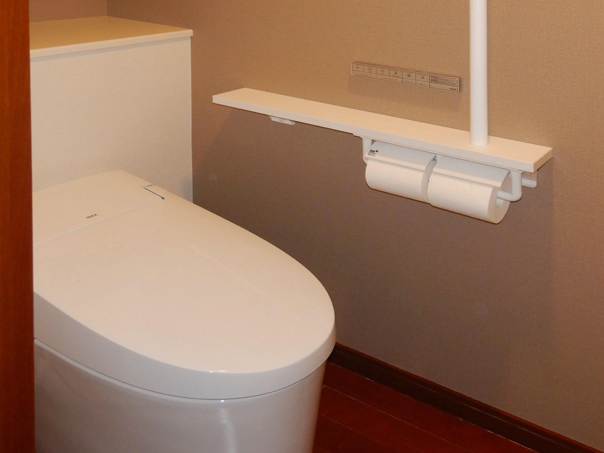 シャワー機能の不具合からトイレのリフォームを検討されました。 シンプル&コンパクトなサティスSのデザインとスマートリモコン、アクセントクロスで落ち着いたトイレ空間になりました。