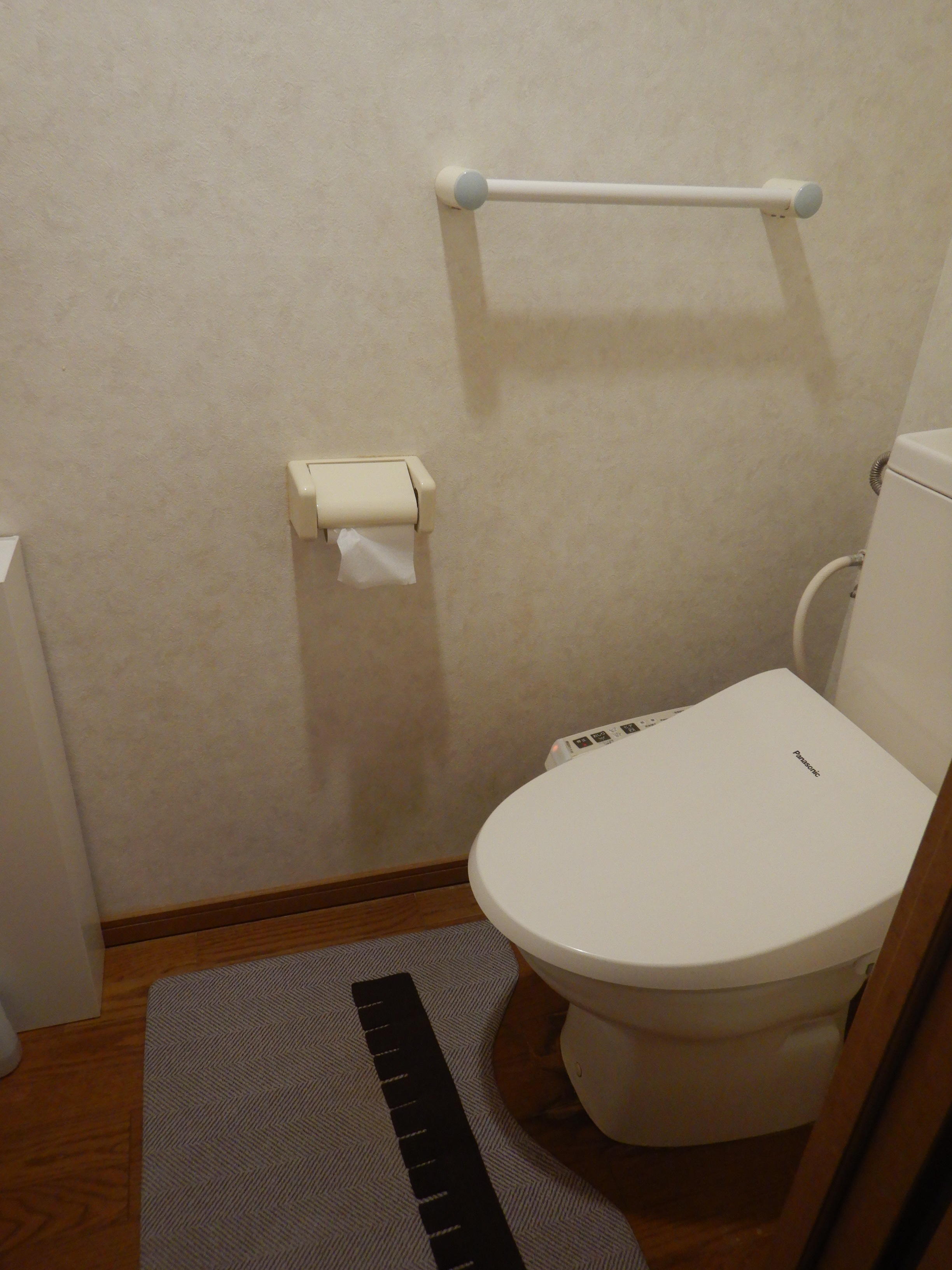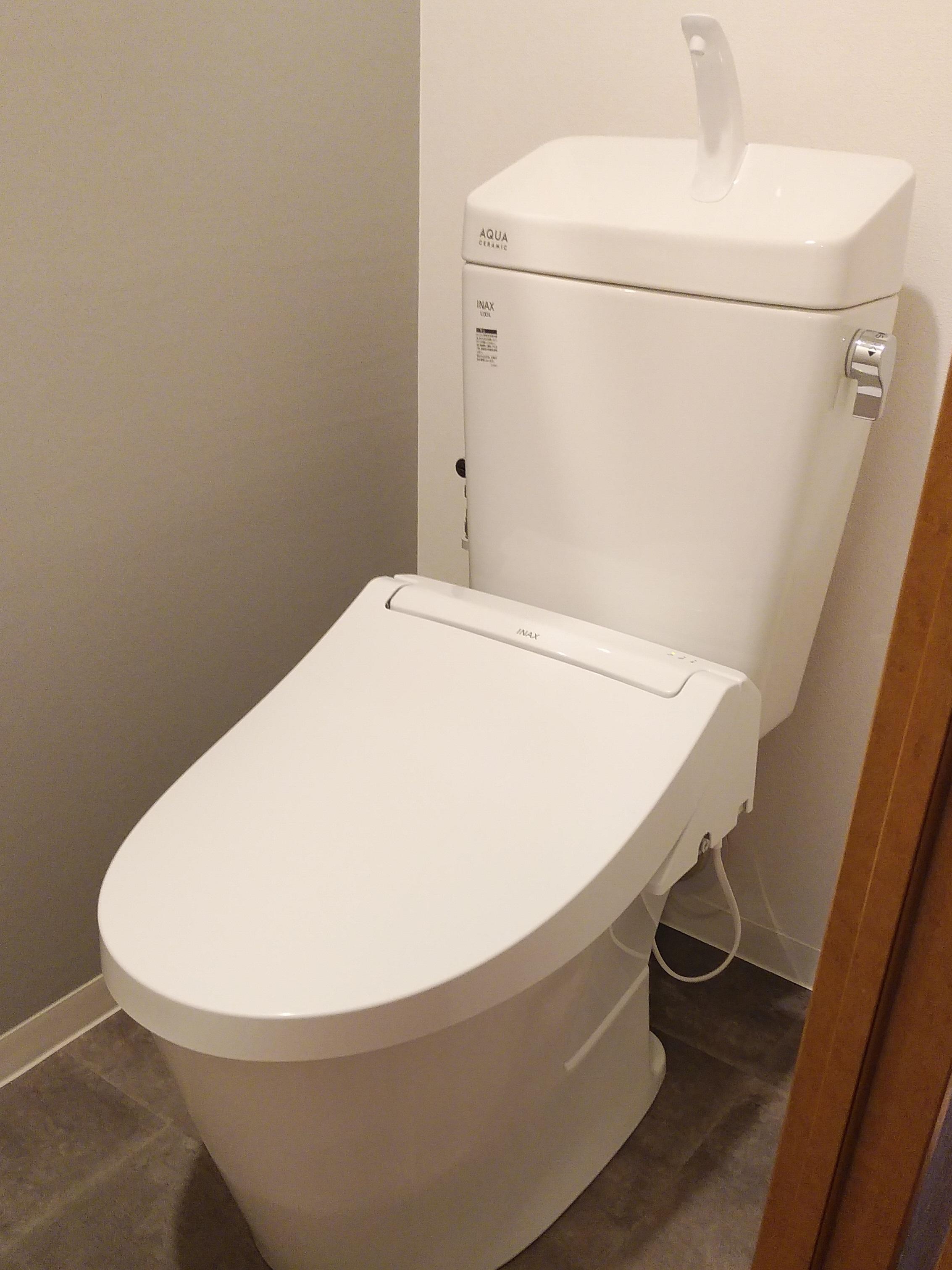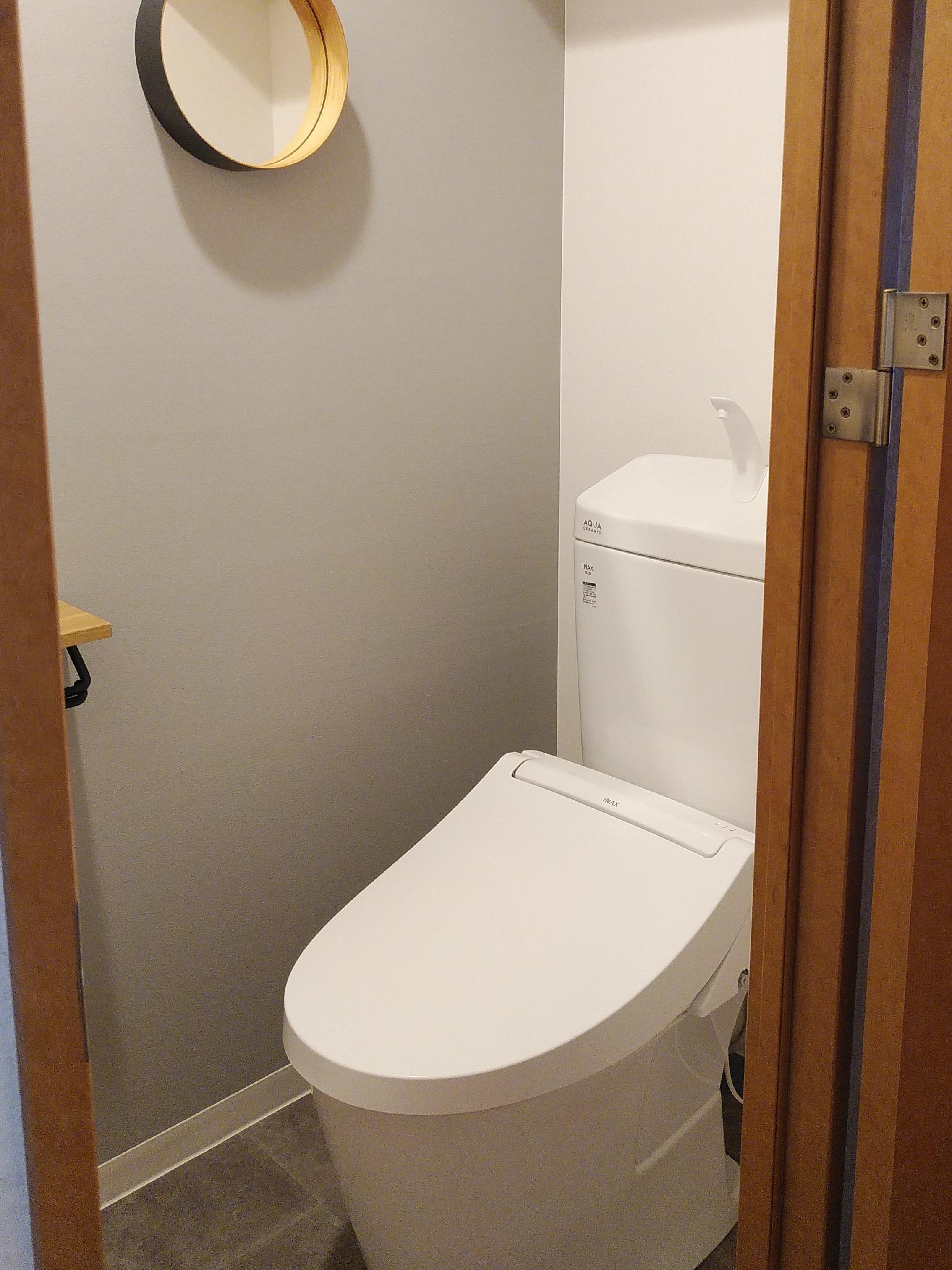 トイレのリフォーム。 グレー系のアクセントクロスやフロアタイルで、シンプル&落ち着けるトイレ空間になりました。