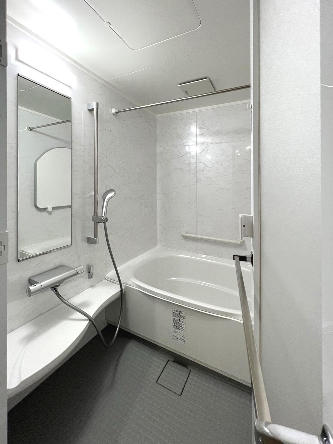 ホワイトカラーでまとめた清潔感ある浴室です。【浴室:LIXIL リノビオV、壁パネルカラー:ホワイトストーン】