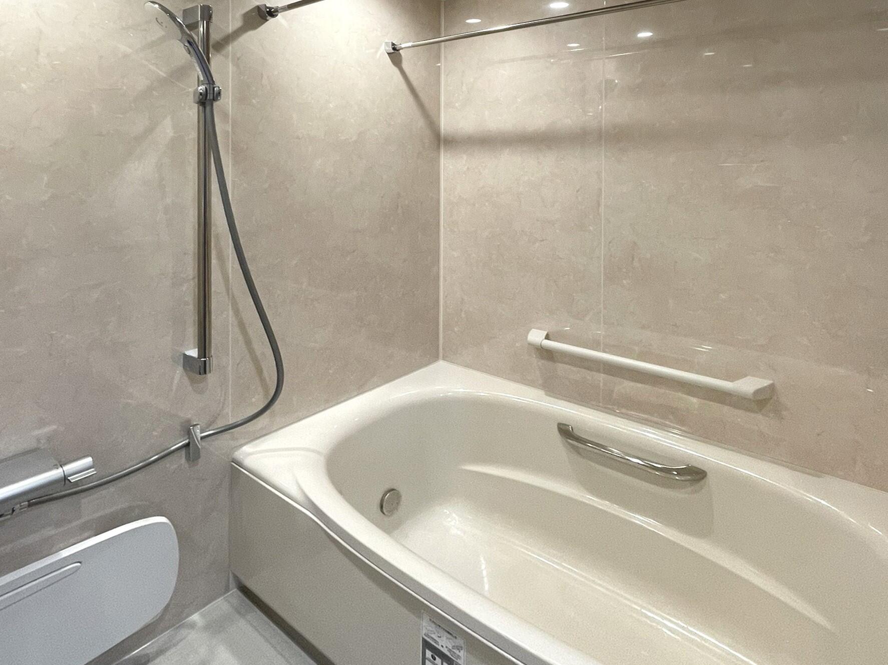 まる洗いカウンター (すっきり収納タイプ)コンパクトで取り回しがよく、パタンと倒し壁面に収納して洗い場を広くすることで、親子での入浴や立位でのシャワーの浴びやすさなど、様々な使用シーンに対応します。【浴室:LIXIL リノビオV、壁パネルカラー:ボテチーノベージュ】