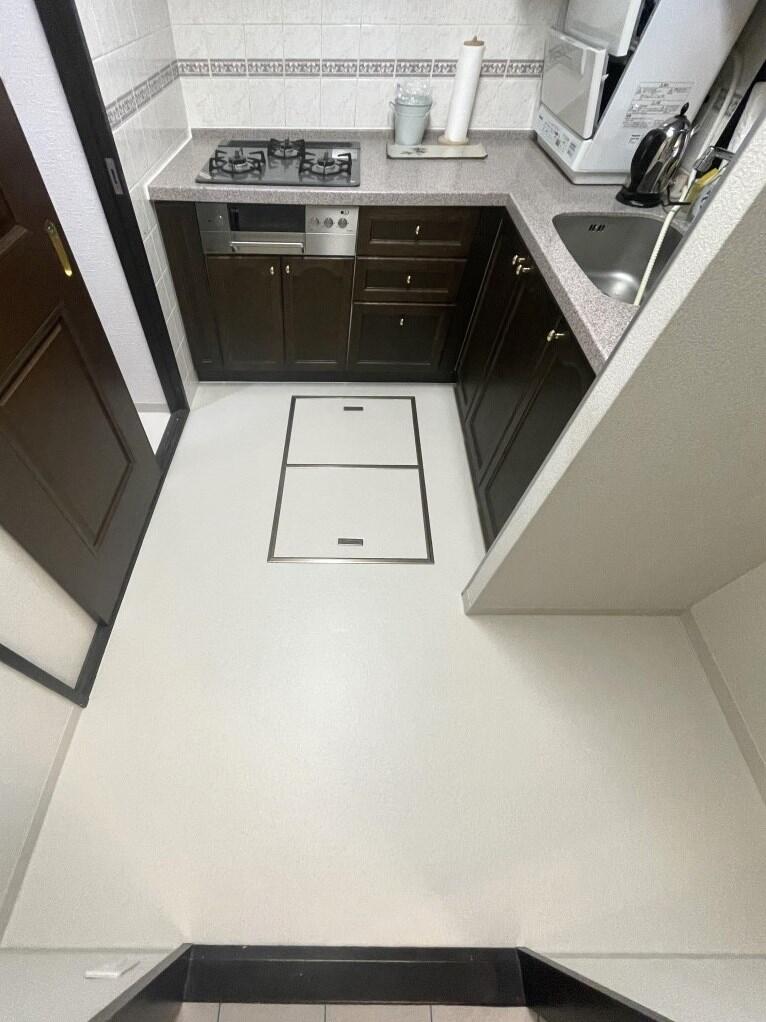 洗面脱衣室の内装とキッチン床を貼替えリフレッシュしました。キレイで明るくなりました。【洗面脱衣室:天井/BA6164(シンコール)、壁クロス/BA6072(シンコール)】【洗面脱衣室・キッチン:床/HM-16154(サンゲツ)】
