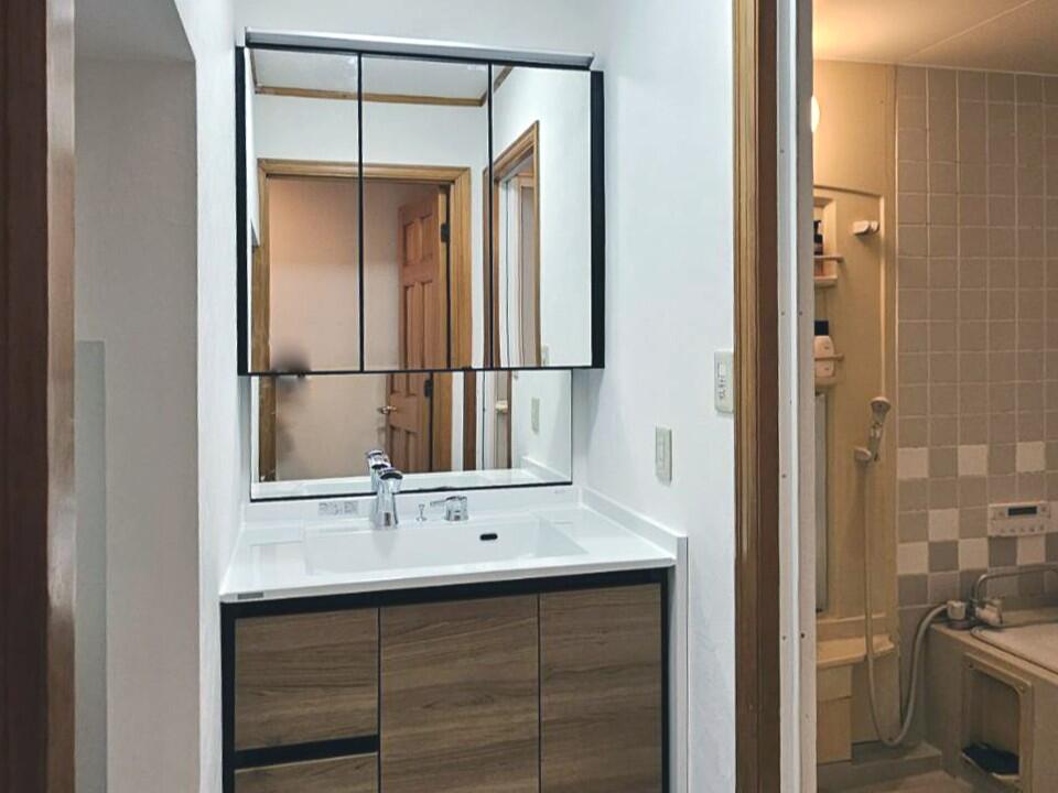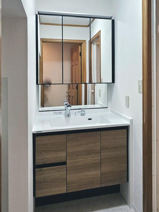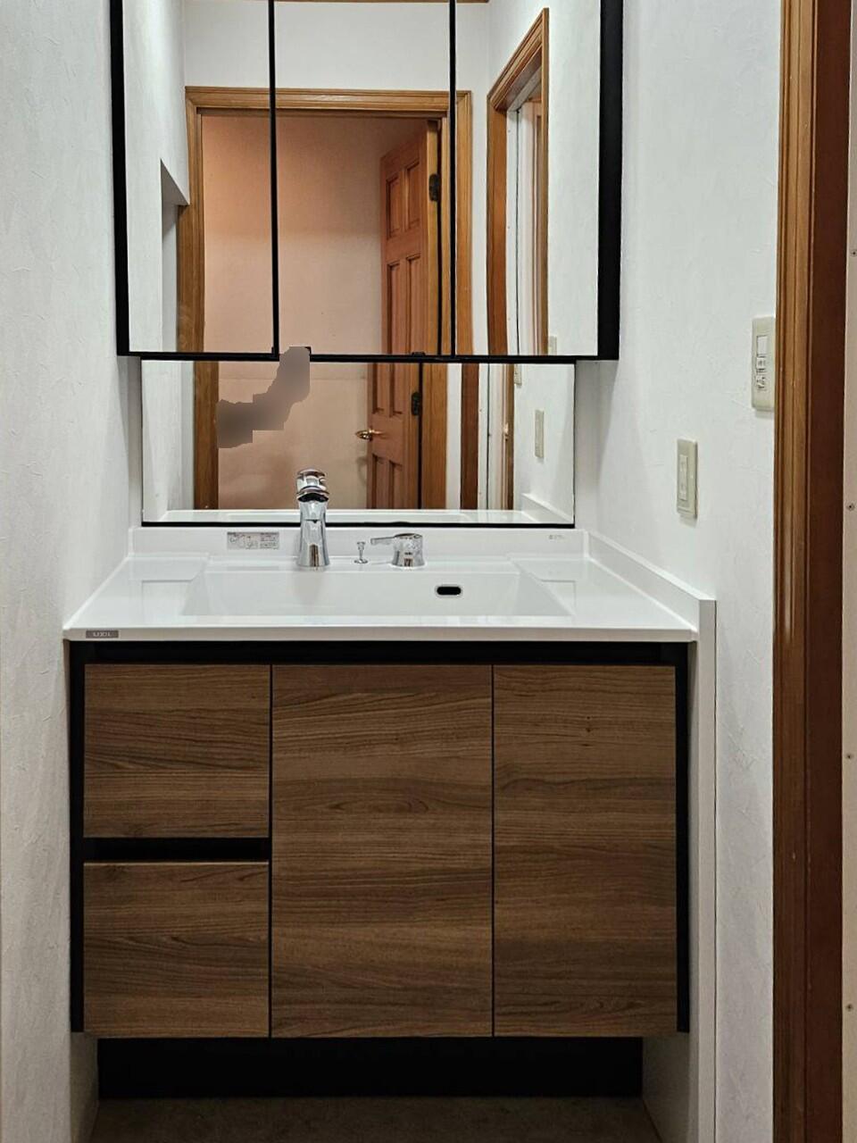 洗面化粧台の下からの水漏れをきっかけに、洗面空間のリフレッシュ工事をご依頼いただきました。 数年前から漏れたり止まったりを繰り返し、その都度様子を見ながら使われていたそうですが、「そろそろ取り替え時期かも」とご相談くださいました。 「壁から壁までぴったり納めたい」というご希望があり、サイズオーダーにも柔軟に対応できるルミシスを。