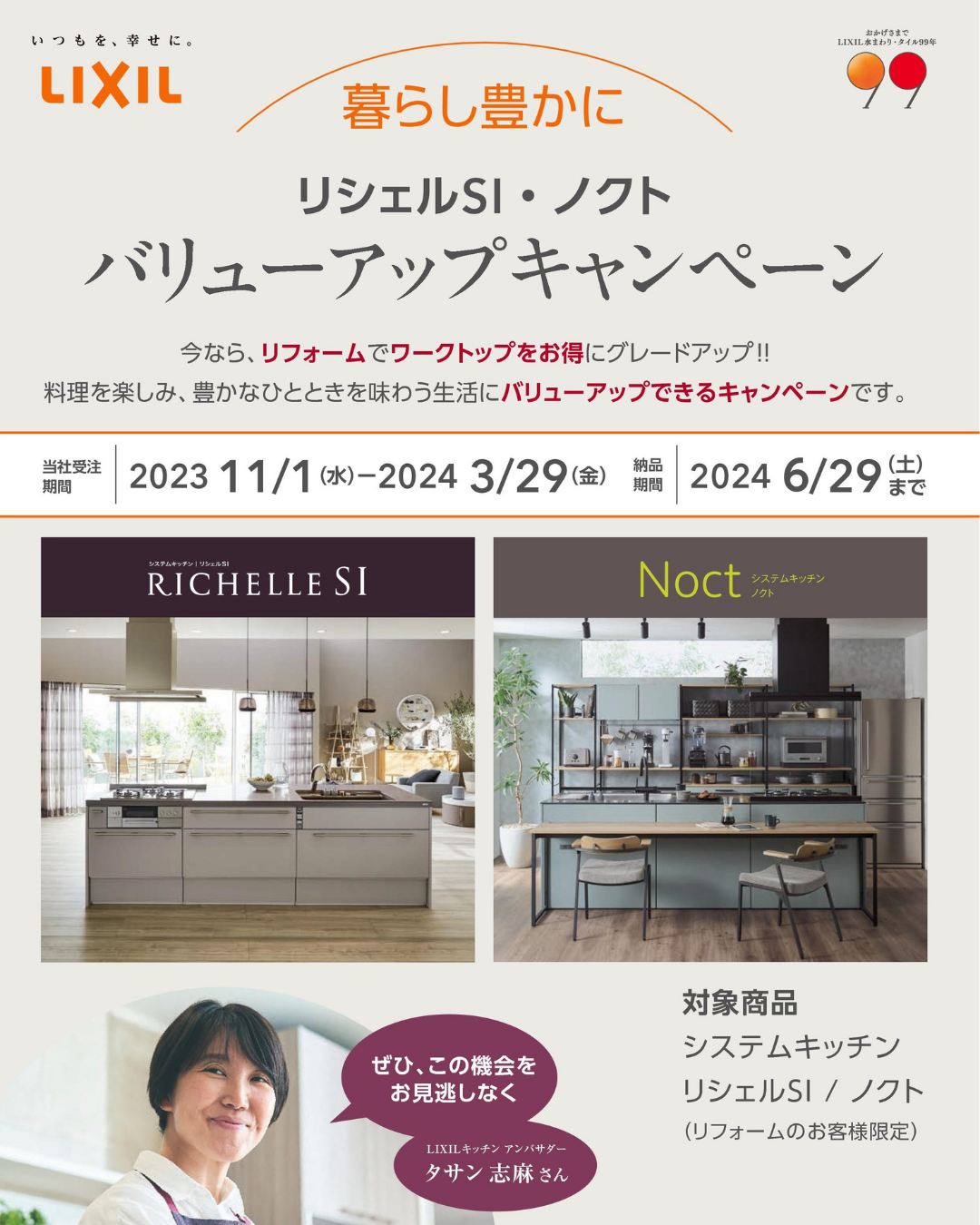 キッチンのリフォームで「リシェルSI」と「ノクト」のワークトップをお得にグレードアップできる、バリューアップキャンペーンのご案内です。