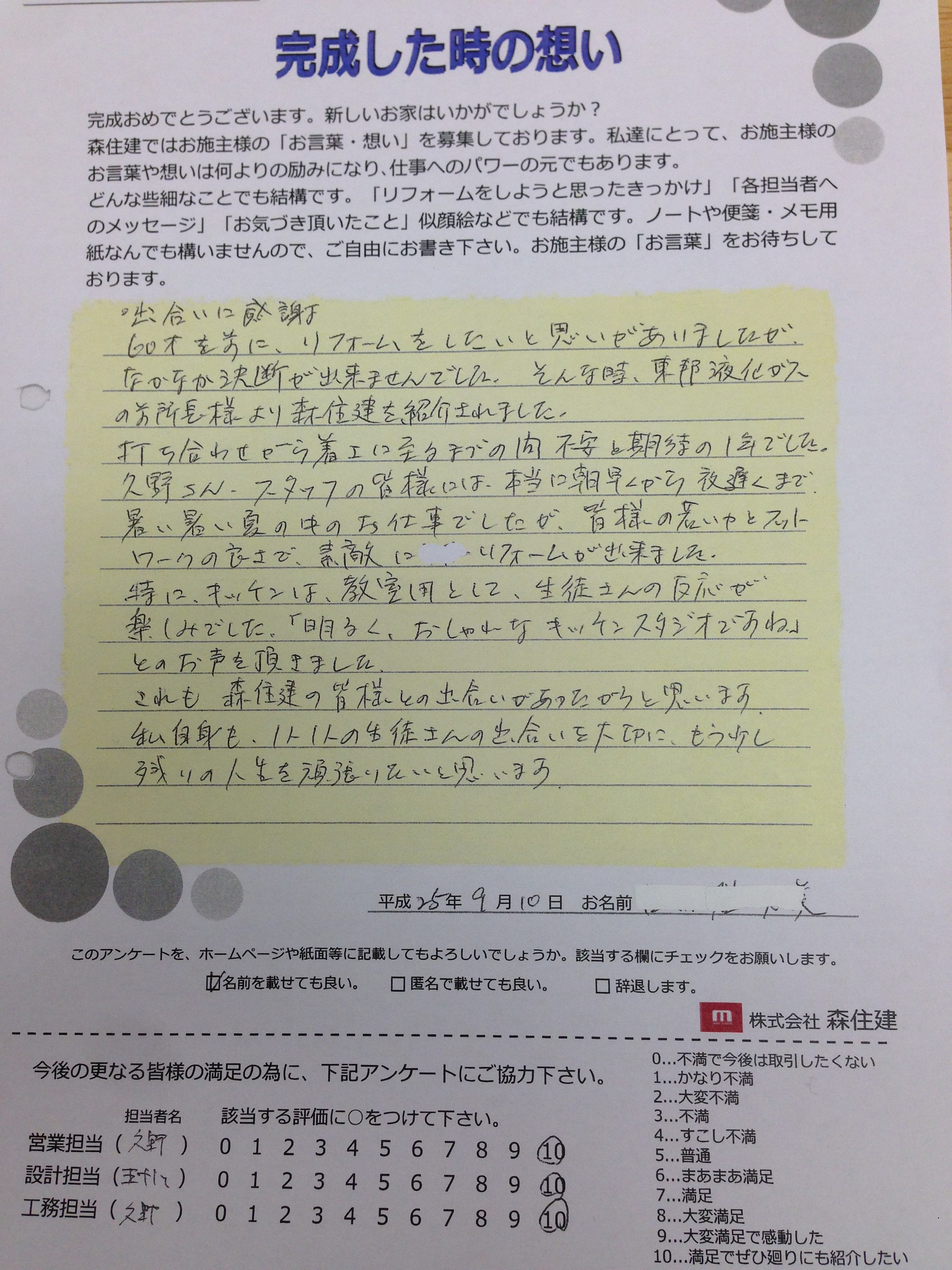 出会いに感謝。 60才を前に、リフォームしたいと思いがありましたがなかなか決断が出来ませんでした。 そんな時、東邦ガスの前所長様より森住建を紹介されました。 打ち合わせから着工に至るまでの間、不安と期待の1年でした。 久野さん、スタッフの皆様には本当に朝早くから夜遅くまで暑い暑い夏の中のお仕事でしたが、 皆様の若い力とフットワークの良さで素敵にリフォームが出来ました。 特にキッチンは、教室用として、生徒さんの反応が楽しみでした。 明るく、おしゃれなキッチンスタジオですね。 とのお声を頂きました。 これも森住建の皆様との出会いがあったからと思います。 私自身も、一人一人の生徒さんの出会いを大切に、もう少し残りの人生を頑張りたいと思います。